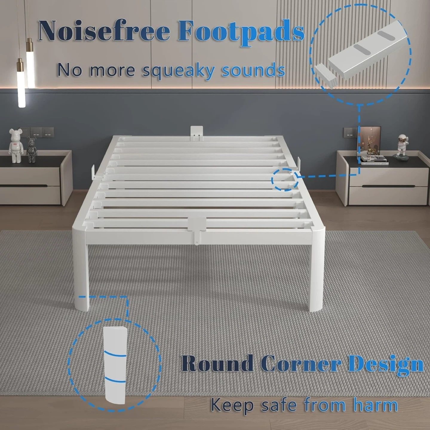 Equipped with 4 anti-slip metal gaskets, you can enjoy a worry-free night’s sleep with the twin platform bed frame. Unlike traditional plastic baffles, our metal design is incredibly durable, providing enhanced strength and long-lasting stability. These metal baffles keep your mattress securely in place, preventing any slipping or sliding, even during the most restless nights. With the extra security and quiet performance, you can rest easy all night long.