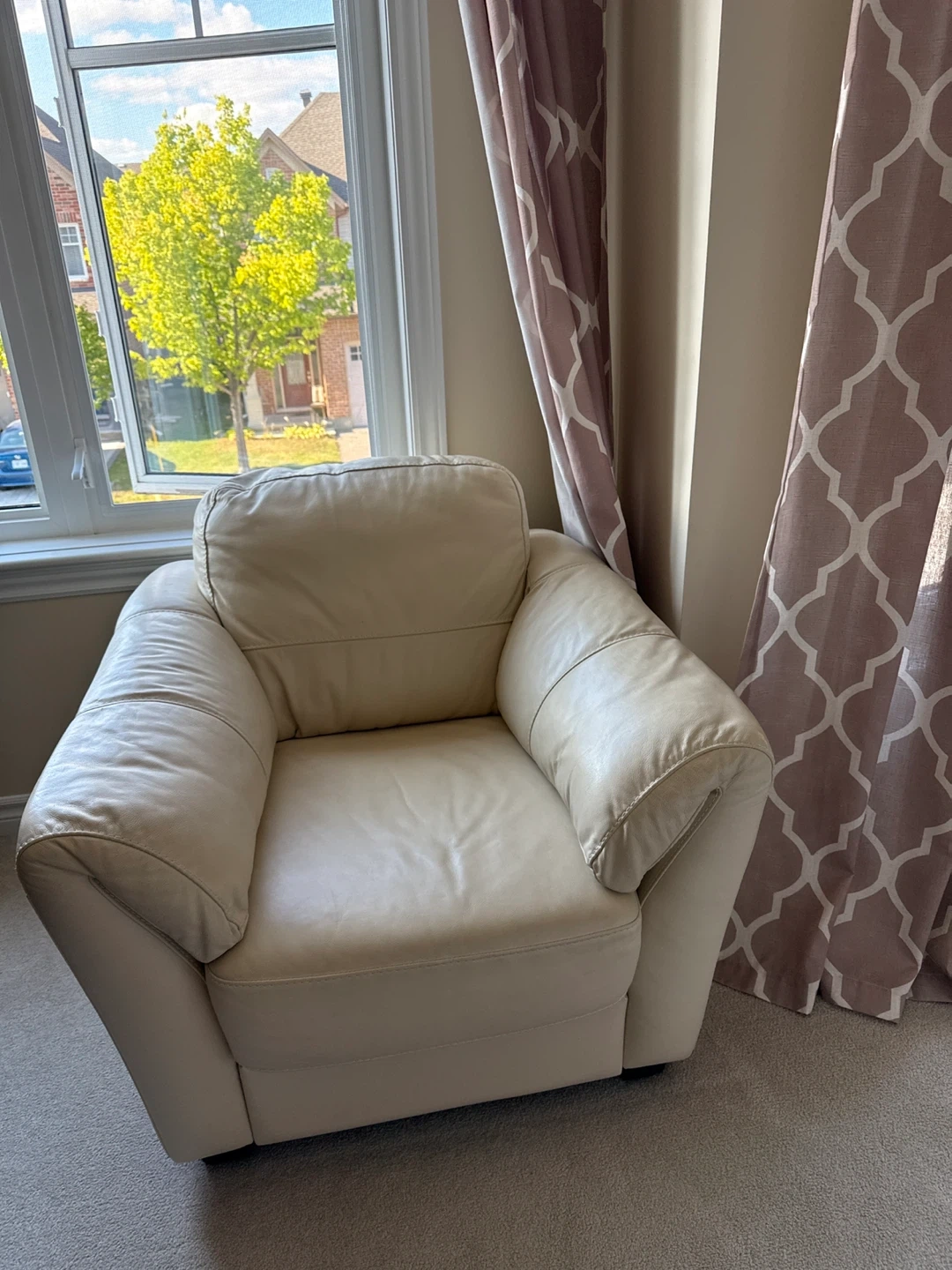 Selling a comfy cream-coloured leather armchair. It's in good condition and perfect for adding a cozy touch to any room. It has a classic design that will blend well with any decor.