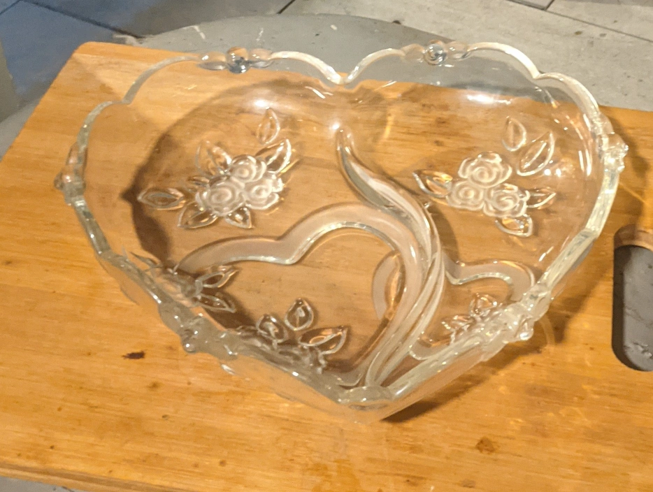 Selling a charming heart-shaped glass candy dish! It features a lovely floral design and is divided into two sections. Perfect for adding a touch of sweetness to your home decor
