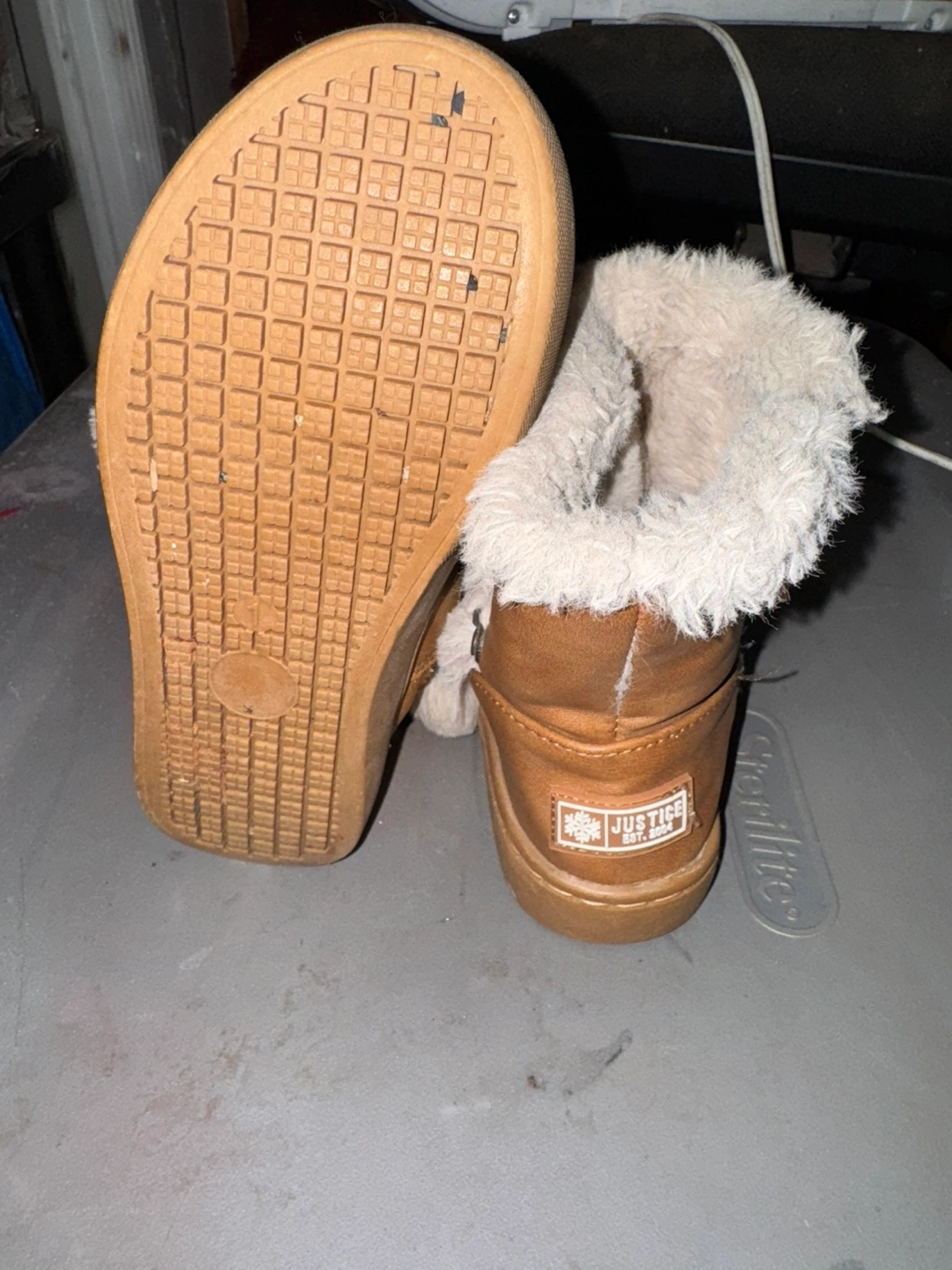 Cozy Justice brand winter boots for girls, size 1. These brown boots feature a faux fur trim and pom-pom details, perfect for keeping little feet warm and stylish during the colder months