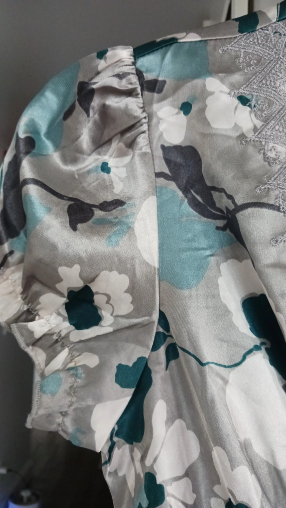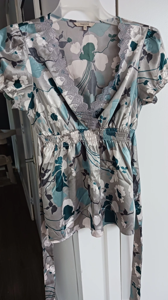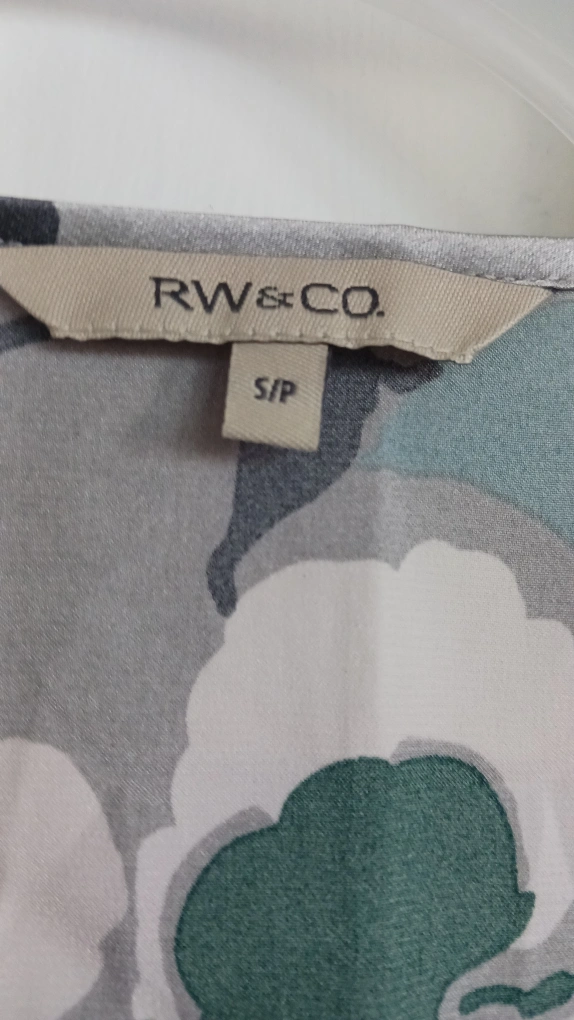 1000+This is a cute RW&CO floral blouse in size small! It features a V-neck with lace trim and a tie around the waist. The blouse has a unique pattern and would be a great addition to your wardrobe