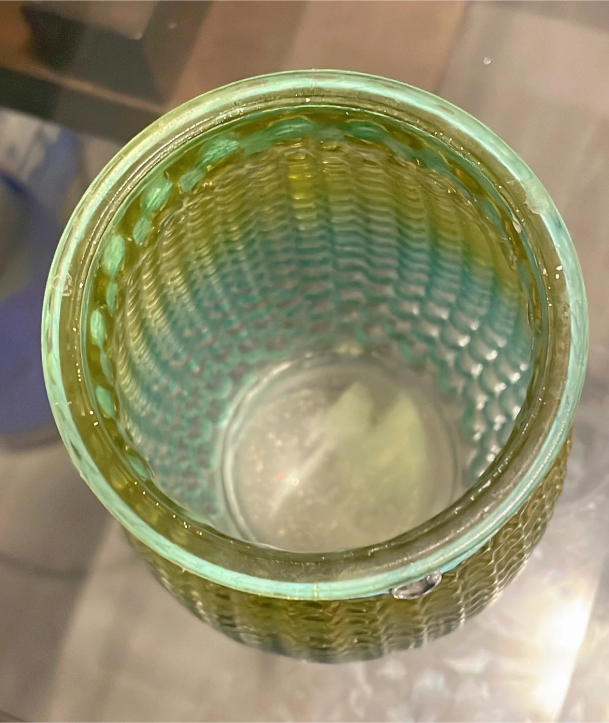 79Selling this decorative glass jar! It features a unique bubble design with a gradient from yellow to blue-green. It's in great condition and would look lovely as a vase or a decorative piece in any room