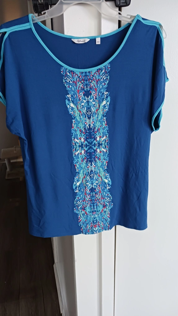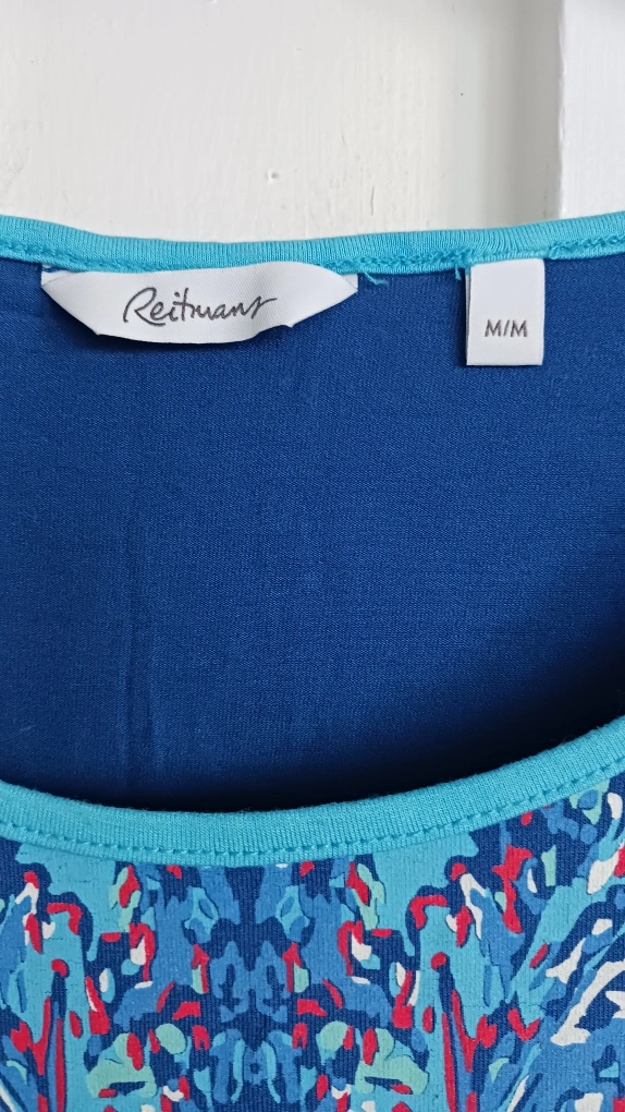 1000+This is a Reitmans top in size medium. It features a beautiful blue colour with a unique patterned design down the front. It's in great condition and ready for a new home!