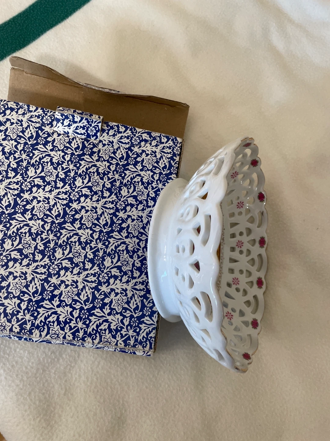 Selling a lovely decorative porcelain bowl. It features a detailed design with a floral and character scene in the center. The bowl has a delicate, openwork pattern around the rim. It comes with its original box too