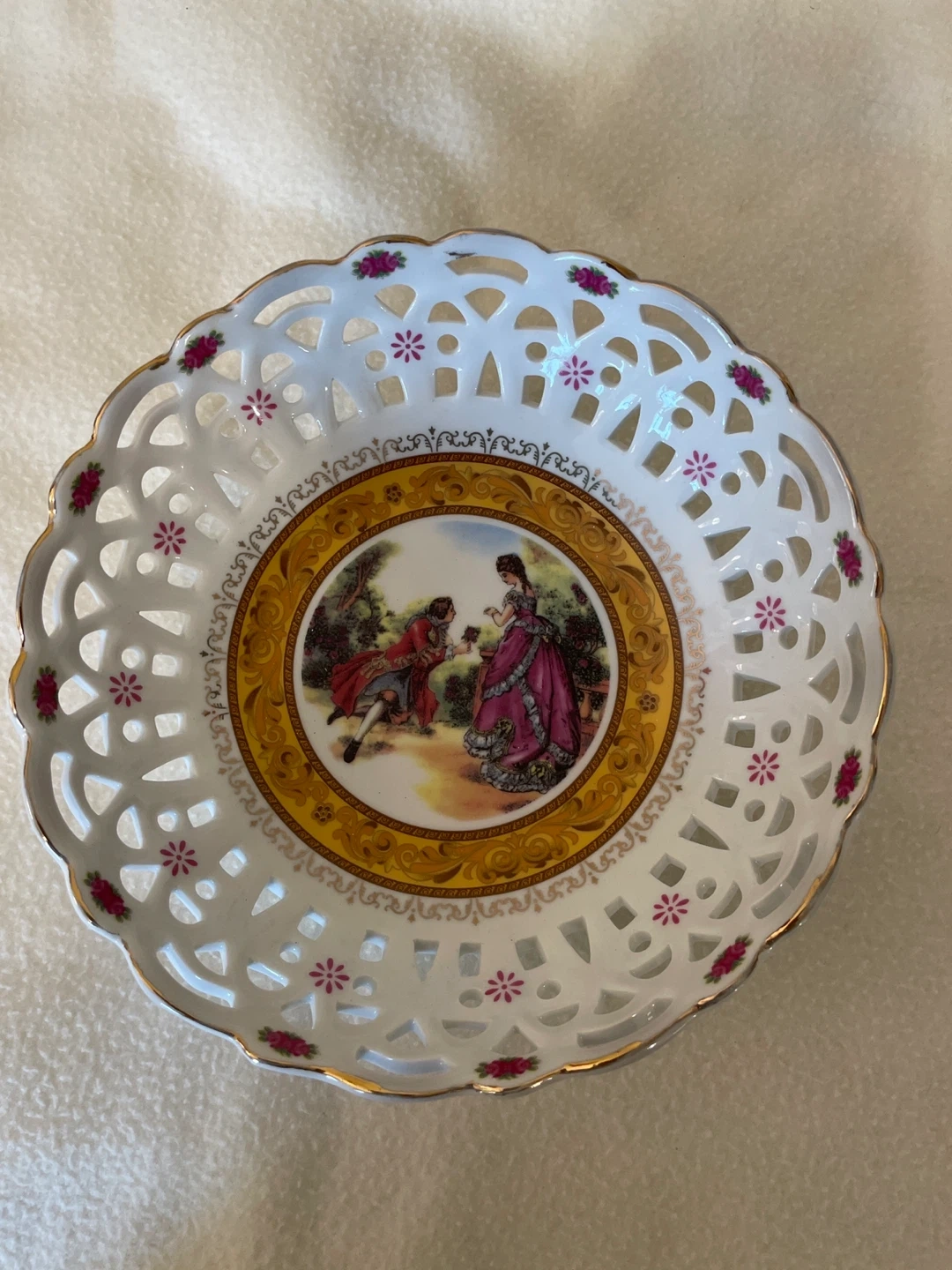 Selling a lovely decorative porcelain bowl. It features a detailed design with a floral and character scene in the center. The bowl has a delicate, openwork pattern around the rim. It comes with its original box too