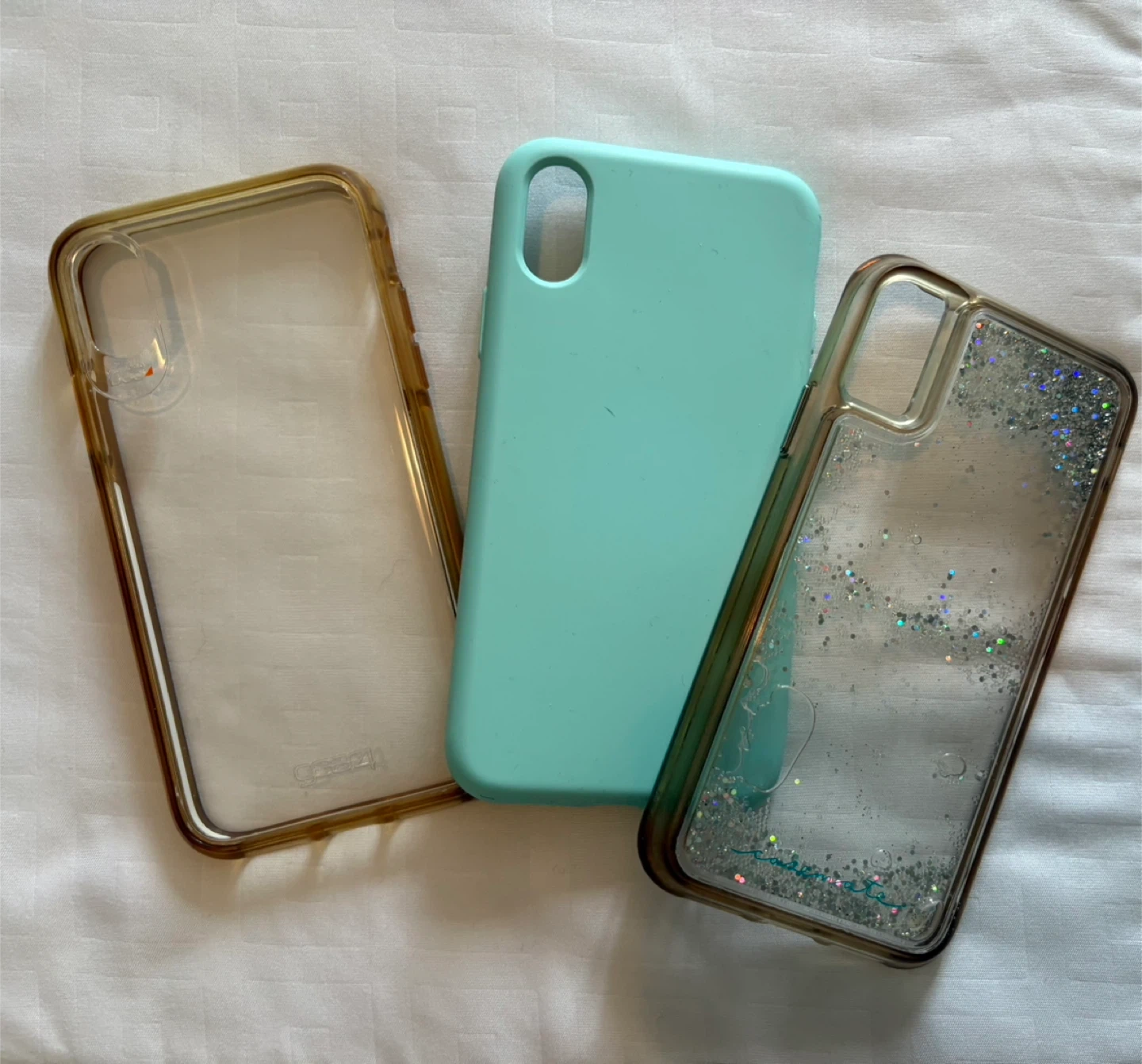 Selling a few iPhone cases! There's a clear Case21 case, a solid light blue case, and a glitter Casemate. All in good condition and ready for a new home!