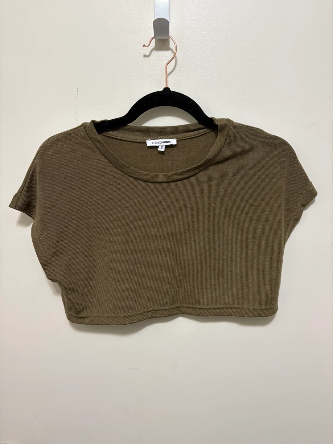 Selling a cute Fashion Nova crop top in a lovely olive green colour! It's a size small and made of 100% polyester. It's in great condition and ready for a new home!