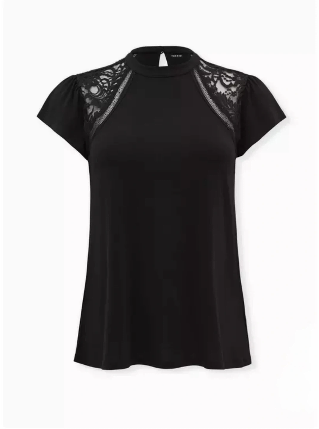 Gorgeous black mock neck top by Torrid, featuring delicate lace insets on the shoulders and a keyhole back button closure. Feminine and versatile—dress it up for work, date night, or wear it casually with jeans.