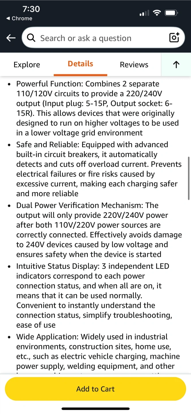 - Combines 2 separate 110/120V circuits to provide a 220/240V output (Input plug: 5-15P, Output socket: 6-15R)