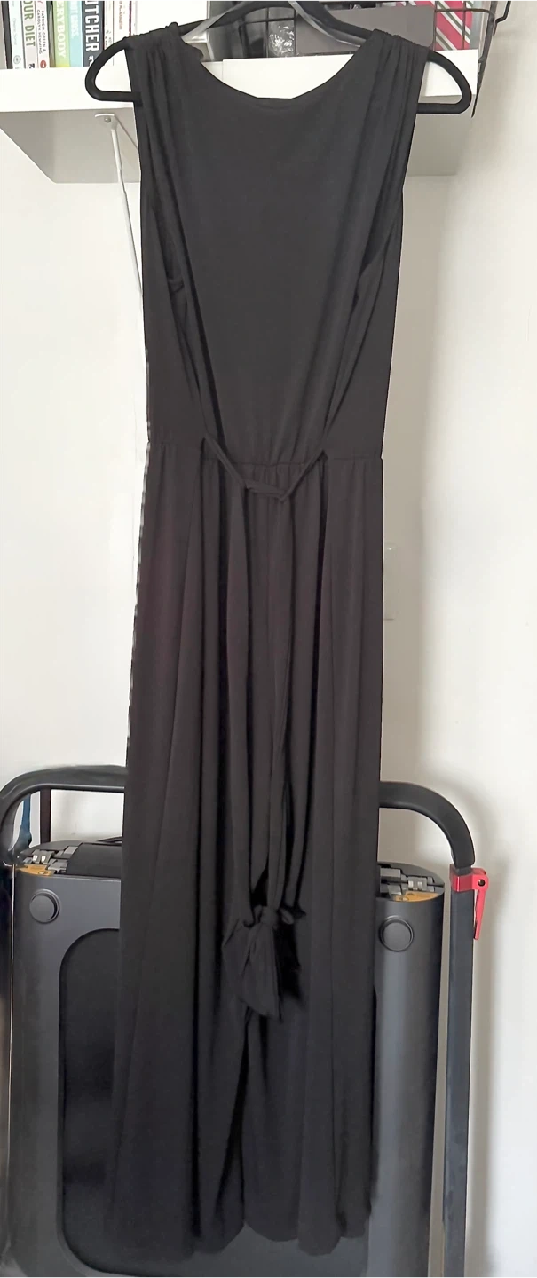 47Chic and versatile sleeveless black V-neck jumpsuit by QUUM, featuring wide-leg pants and a flattering wrap-style bodice with a tie waist. 🖤 Never worn – tag still attached ✂️ Hemmed to fit someone who is 5 feet tall – ideal for petites who want the right length without extra alterations. • Size: 2X • Brand: QUUM • Fit: Stretchy, comfortable knit fabric with flowy wide-leg silhouette • Condition: New with tags – never worn • Purchased from: Your Big Sister’s Closet (Toronto boutique, now closed) Easy to dress up for weddings, work events, or date nights—or wear casually with sandals and a denim jacket. 📍 Pickup near Dufferin & Wilson (Yorkdale area)