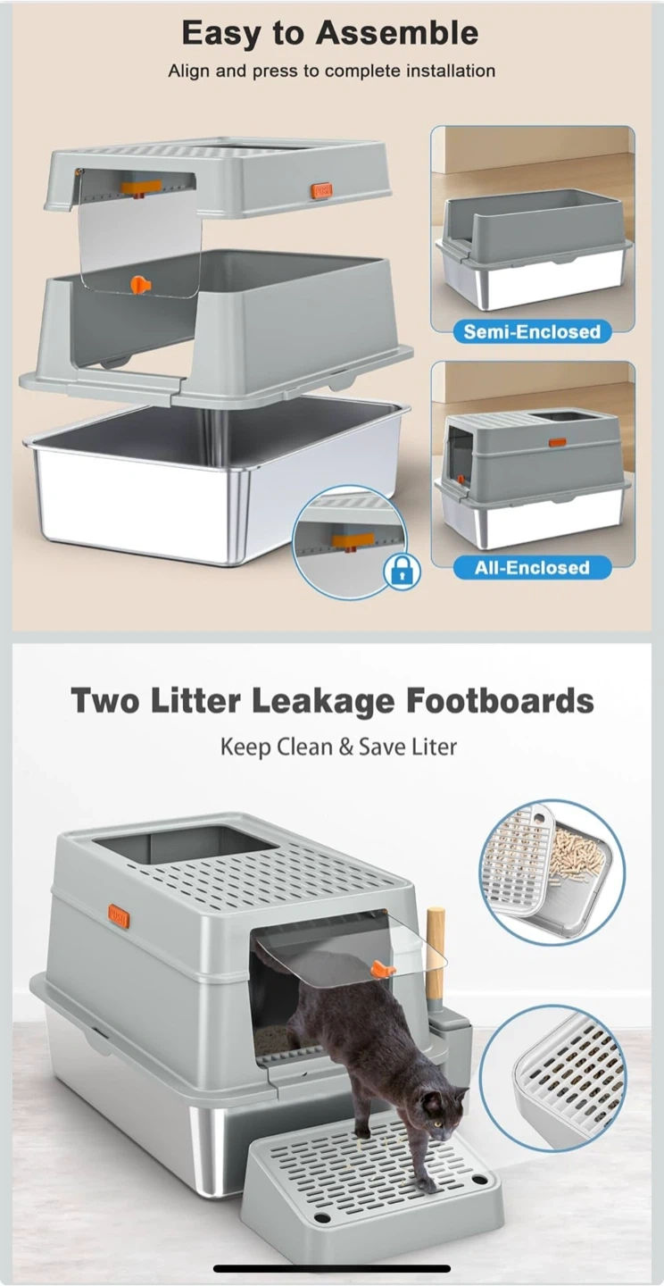 Brand New Enclosed Stainless Steel Cat Litter Box with Lid, Extra Large Metal Litter Pan Tray with High Wall Sides, Large Scoop Holder, Sloping Pedal, Non-Sticky, Anti-Leakage, Easy Cleaning