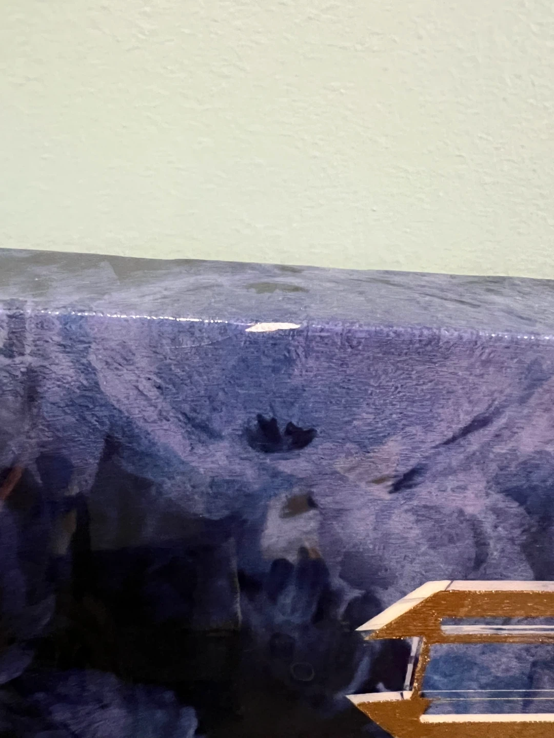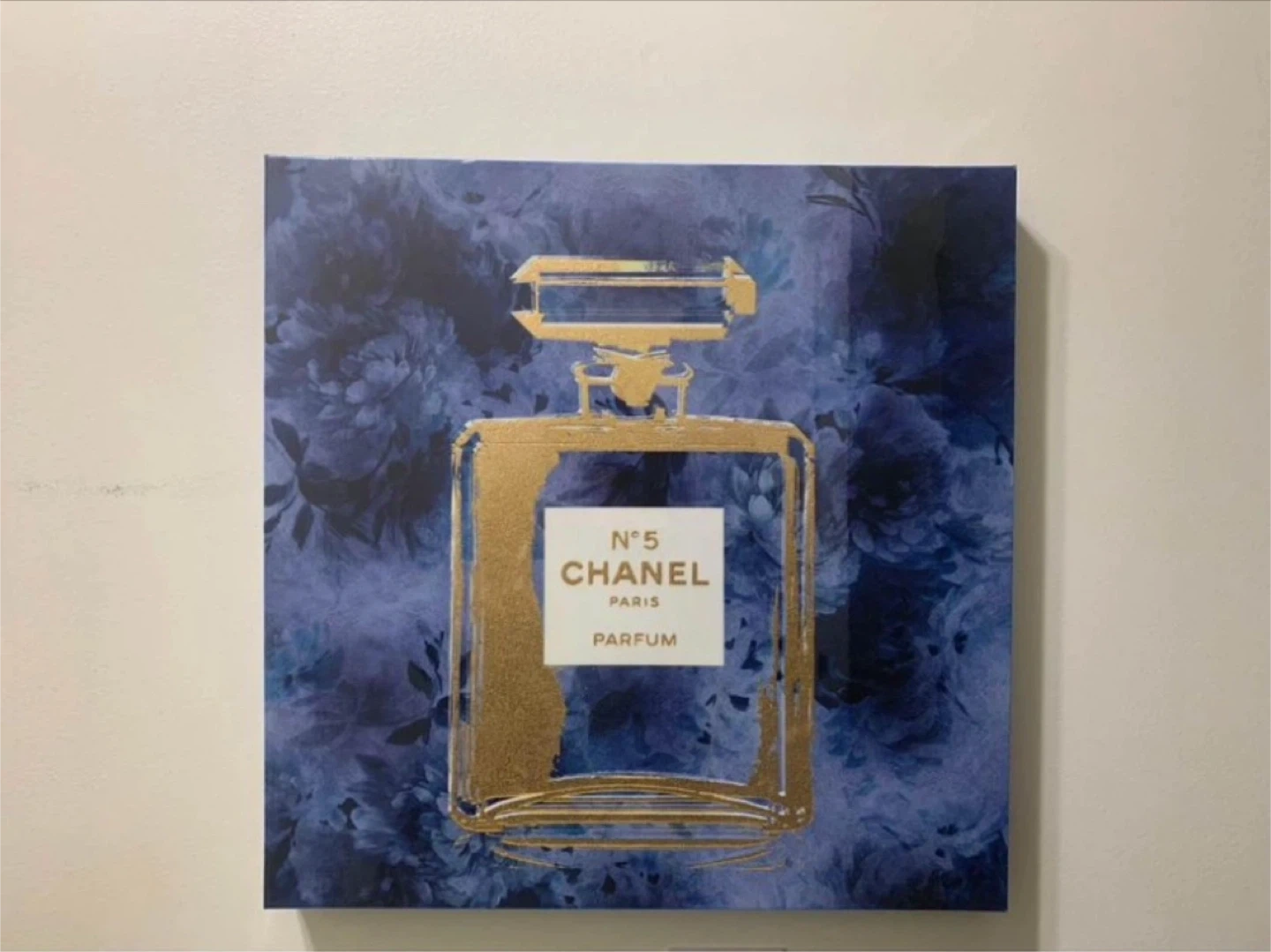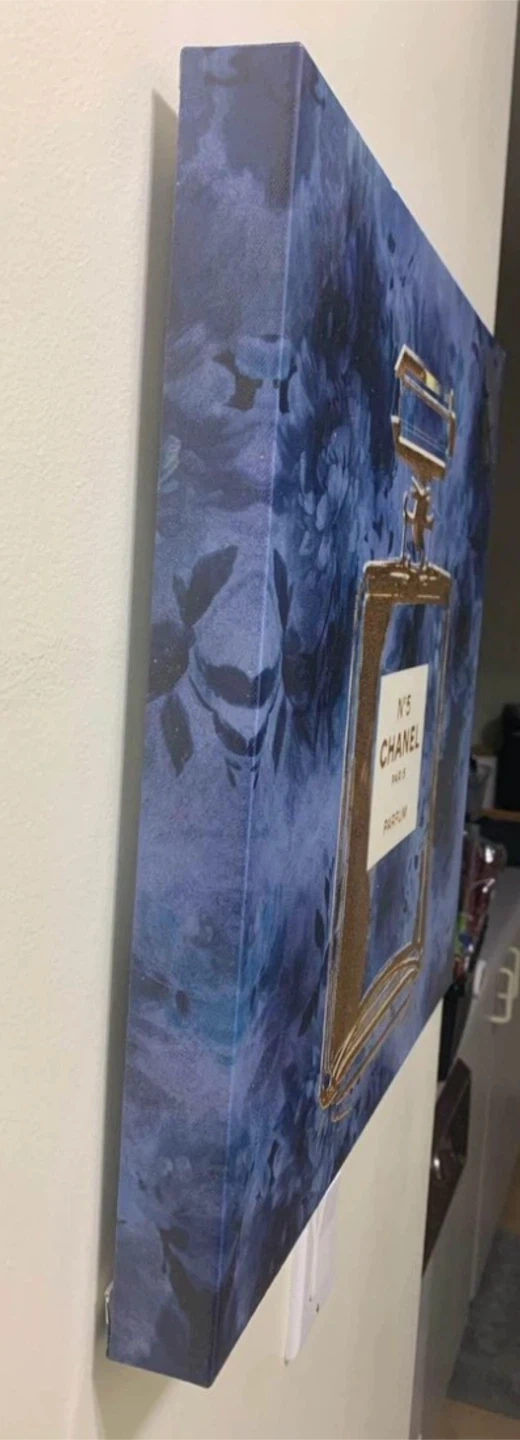 Add a touch of elegance to your space with this Chanel No. 5 Parfum canvas wall art! The canvas features a beautiful blue floral background with a gold Chanel No. 5 perfume bottle design. There's a tiny paint scratch on the top, as pictured, but it's otherwise in great condition.