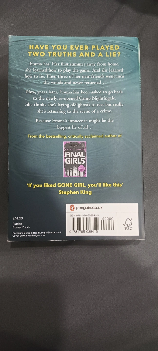Selling a copy of 'Last Time I Lied' by Riley Sager! It's a fiction novel that's perfect for anyone who enjoys a good thriller. The book is in great condition and ready for a new reader