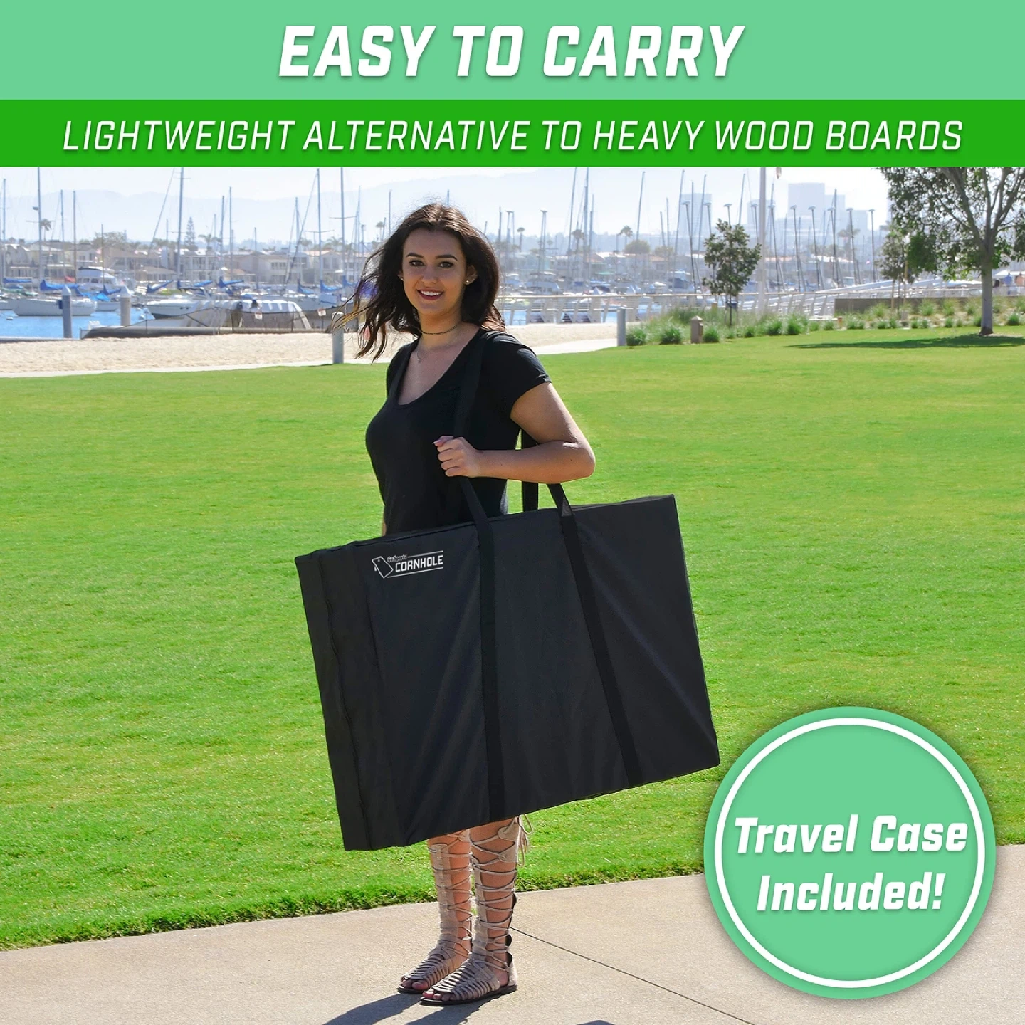 COMPLETE CORNHOLE SET: Includes 2 premium tailgate size 3 x 2 ft boards, 8 all-weather regulation size (6 x 6 inch) and weight (1 lb each) bean bags (4 red, 4 blue), carrying case, and game rules