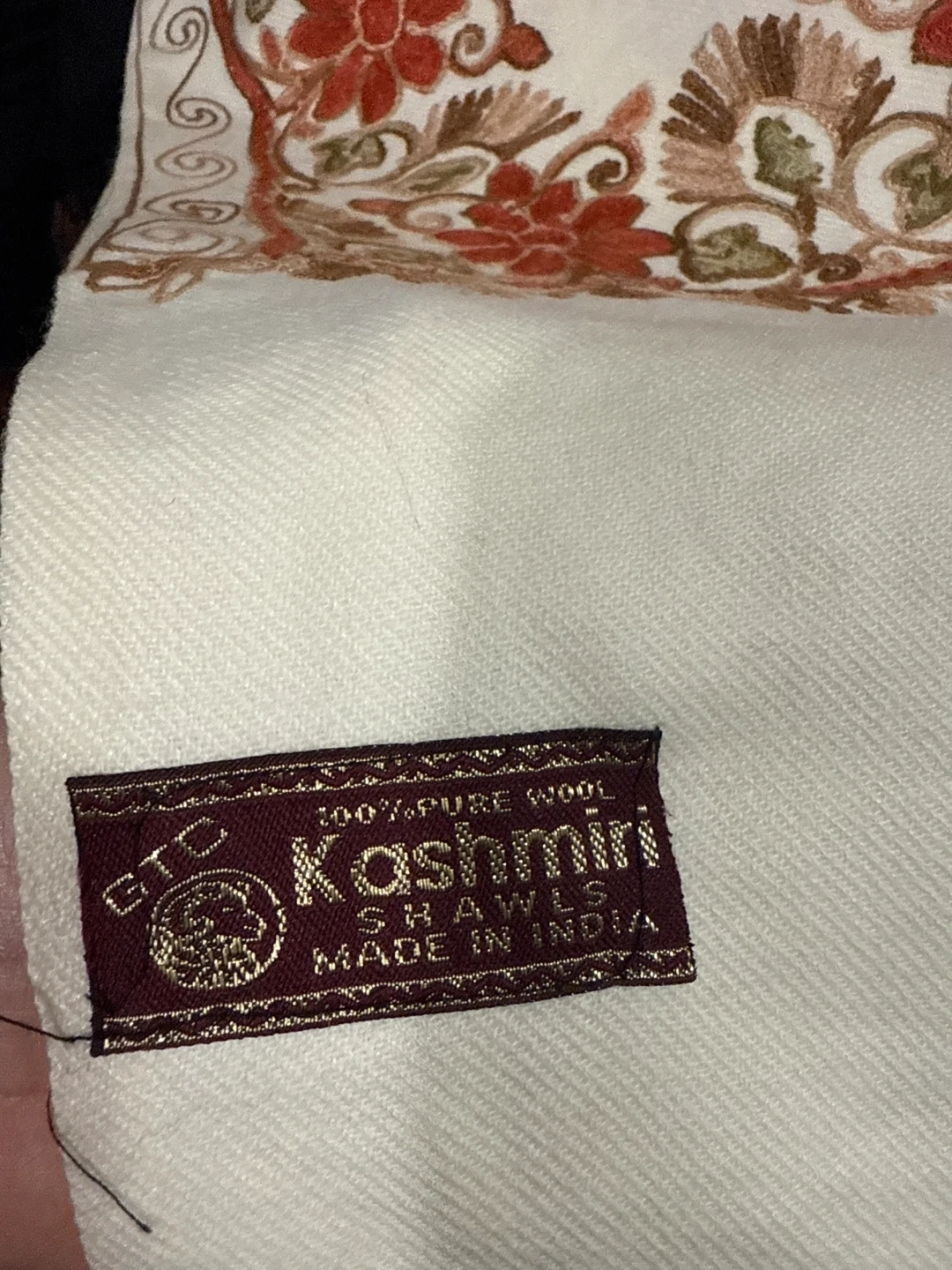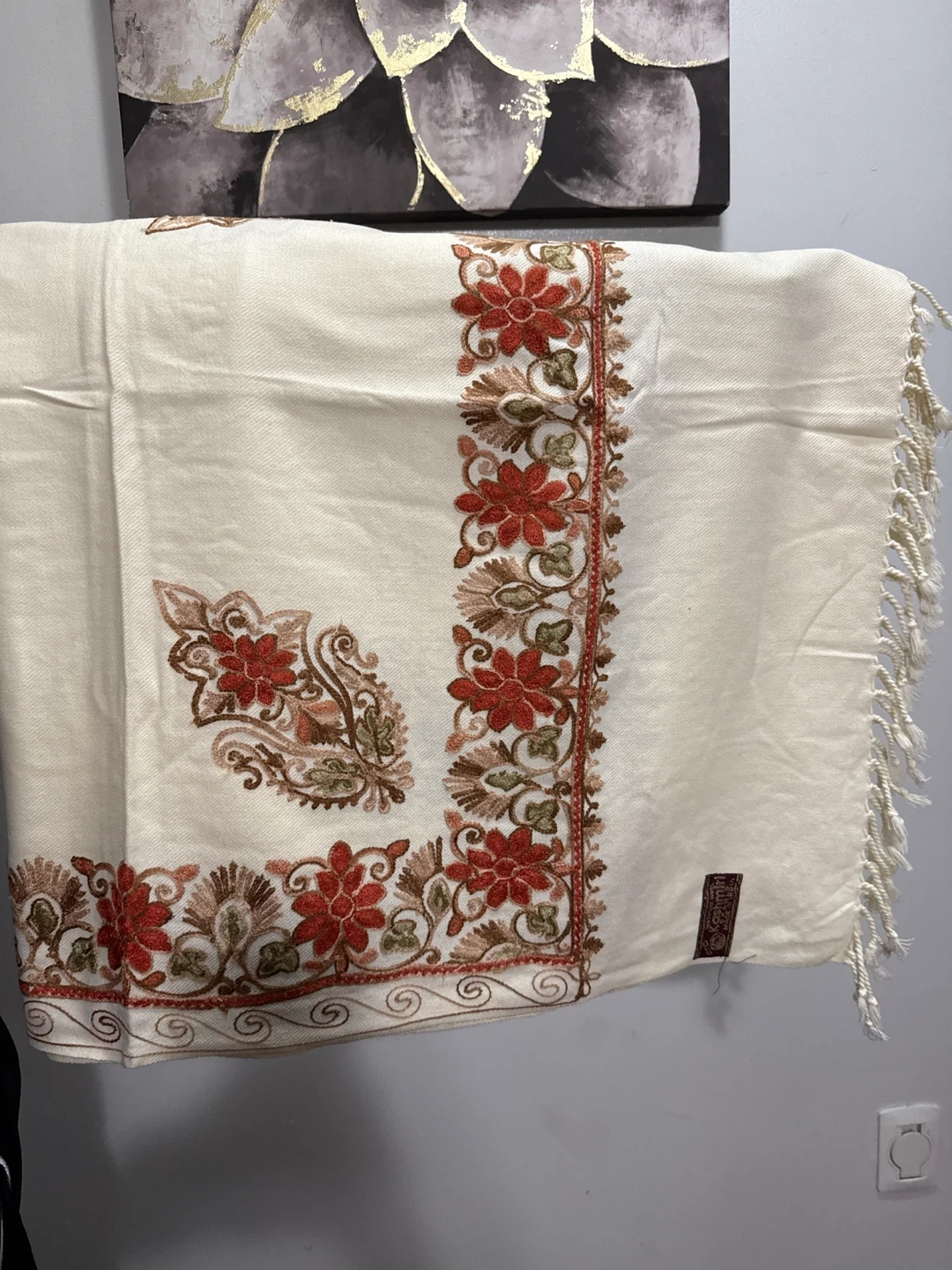 75Selling a beautiful Kashmir shawl made of 100% pure wool. It features lovely floral embroidery. Perfect for adding a touch of elegance to any outfit!