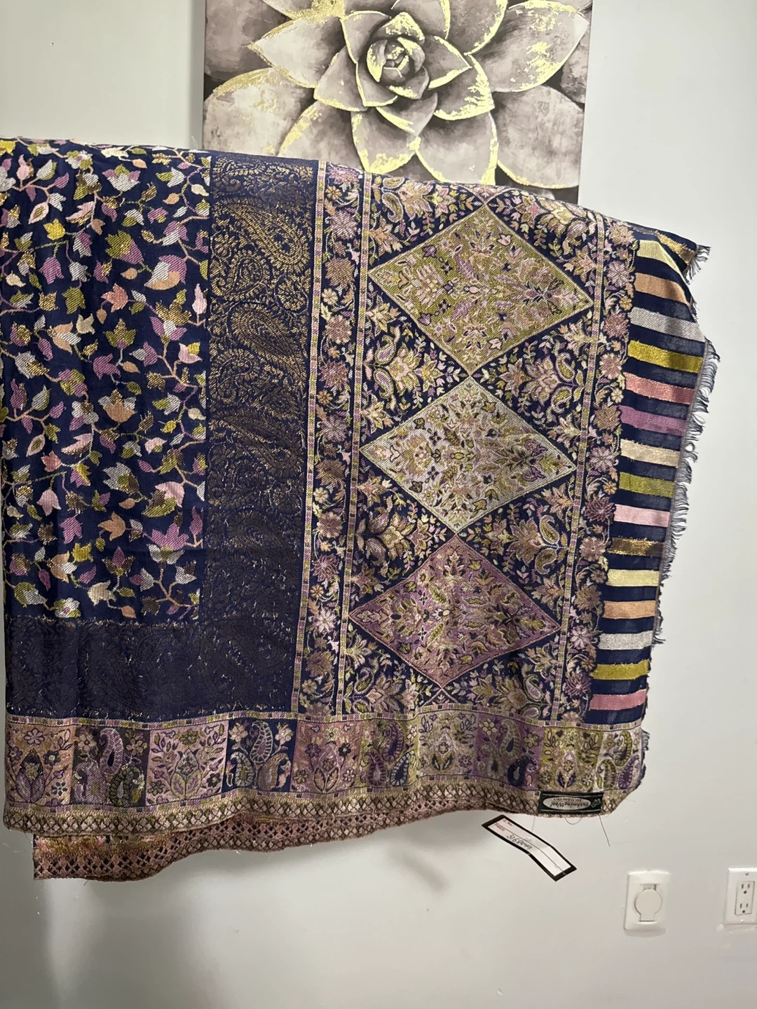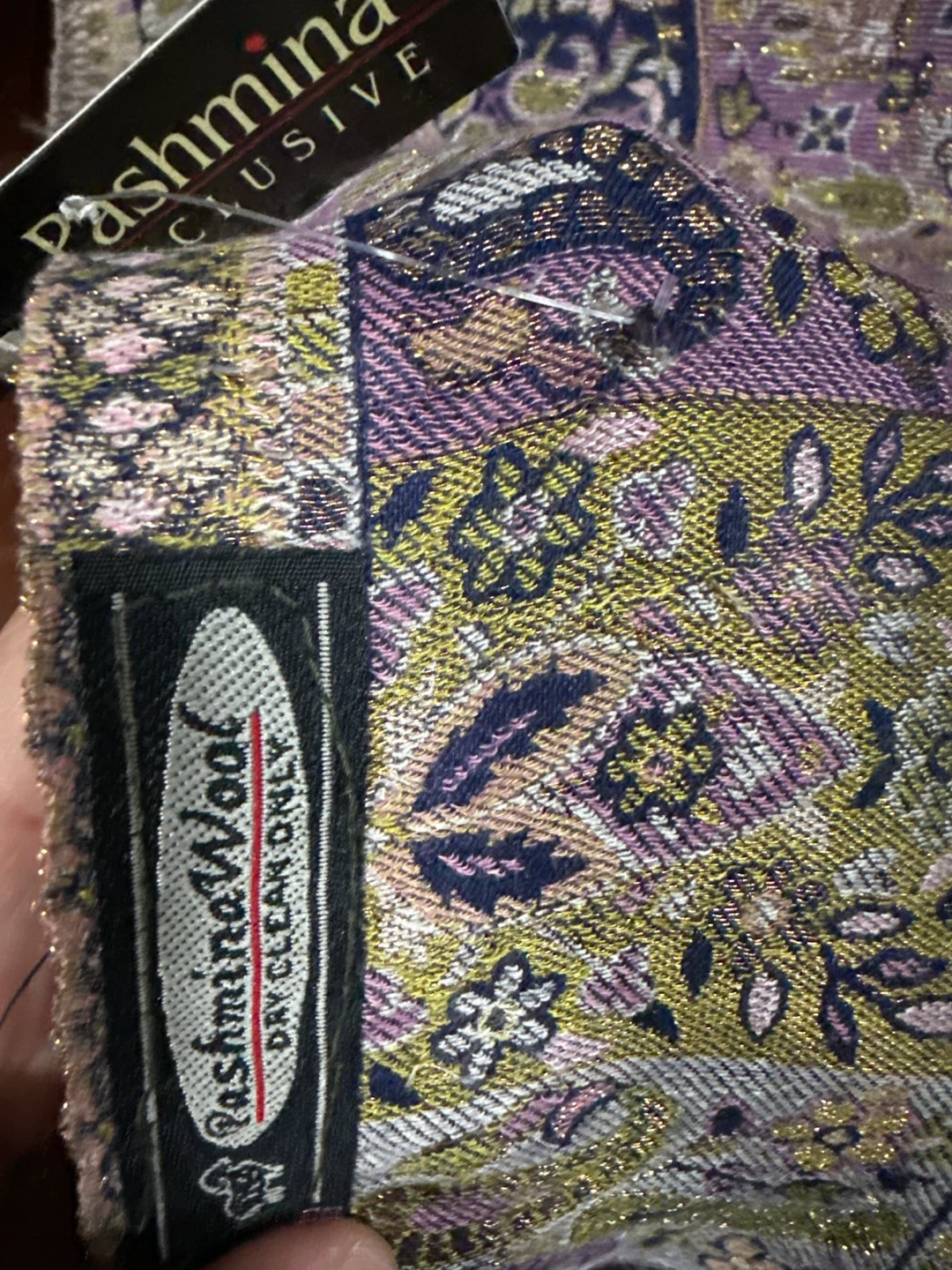 75Check out this beautiful Pashmina Wool scarf! It features an exclusive design with intricate patterns and a lovely colour palette. The label indicates it's dry clean only. Perfect for adding a touch of elegance to any outfit!