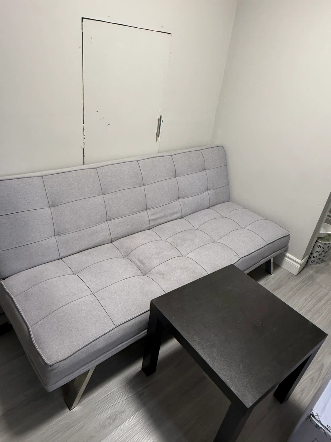 Sturdy comfortable futon couch that can be used as wbed. Has good strong legs and good support for the back. It has little stain. Barely visible