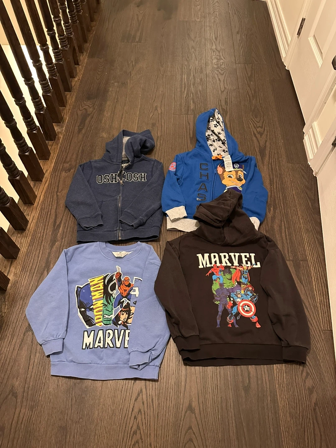 A bundle of gently used kids' sweatshirts and hoodies! Includes: - An OshKosh navy blue zip-up hoodie from Carters - A blue Paw Patrol hoodie featuring Chase - A light blue Marvel sweatshirt from H&M - A black Marvel hoodie with various characters from H&M Size 5T. Pickup in Markham - Markham Rd & 16th Avenue. Smoke free, pet free environment. During weekdays, alternate pickup location is Downtown Toronto around Yonge and Bloor or around Leslie/Highway 7 in Richmond Hill.