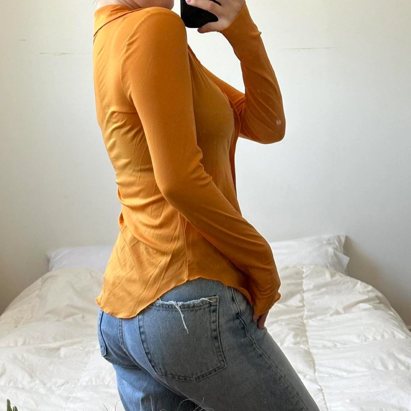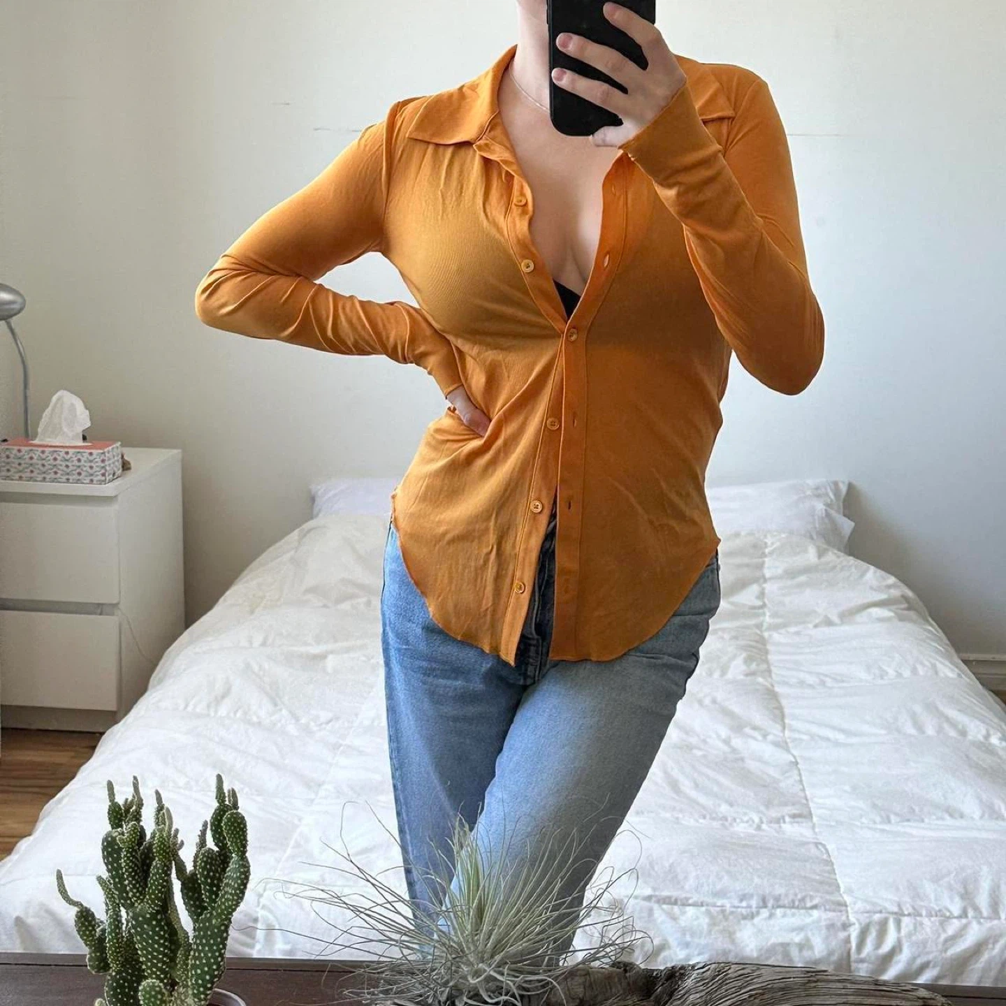 Aritzia orange long sleeve sheer button up shirt