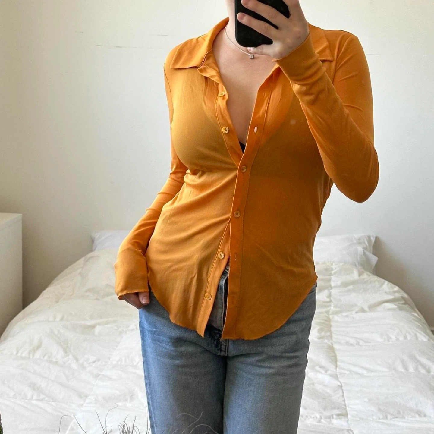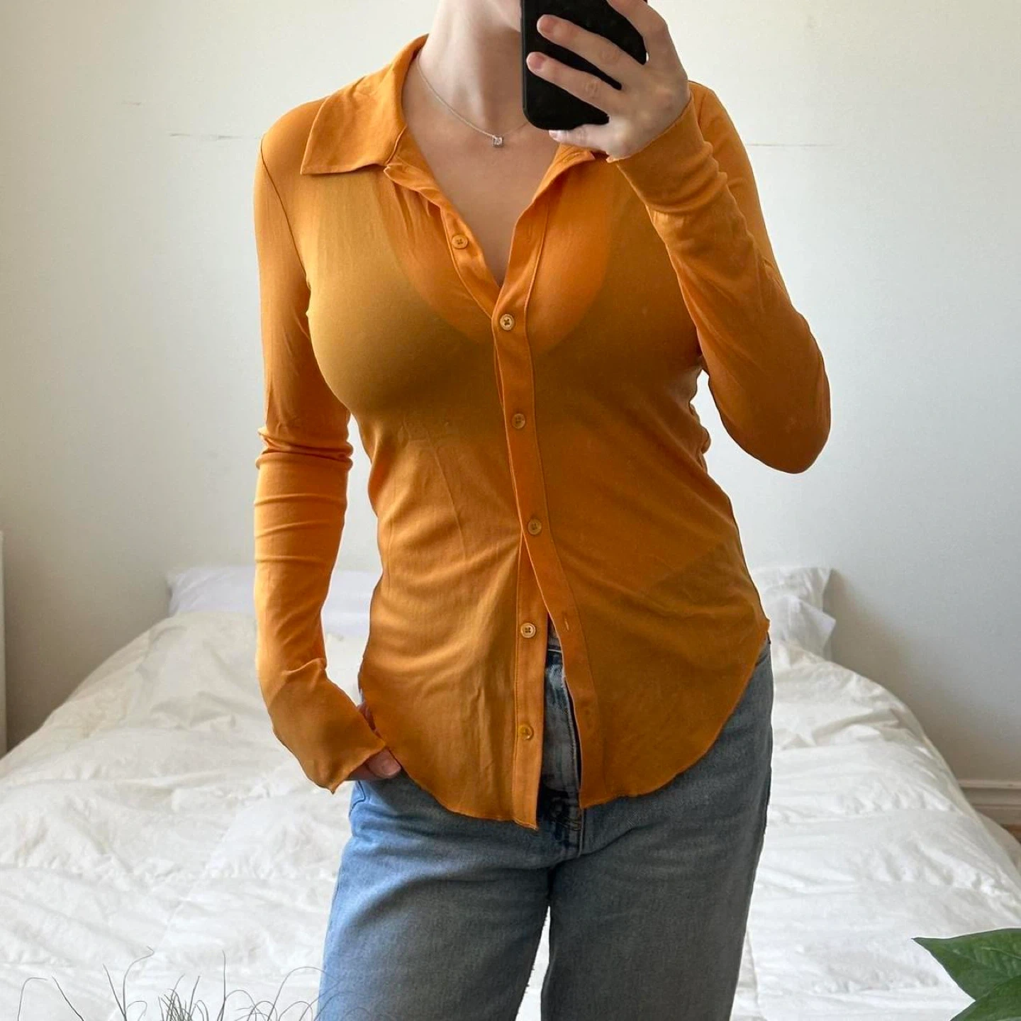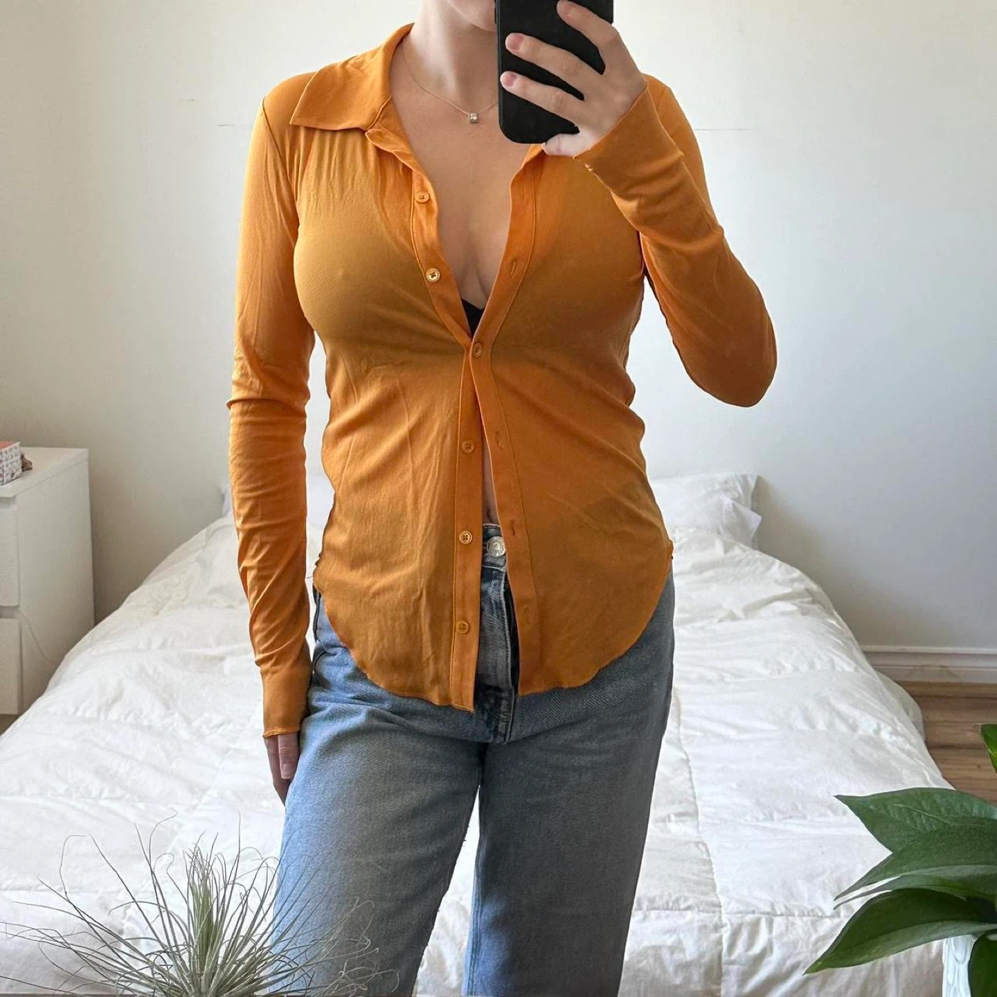 Aritzia orange long sleeve sheer button up shirt