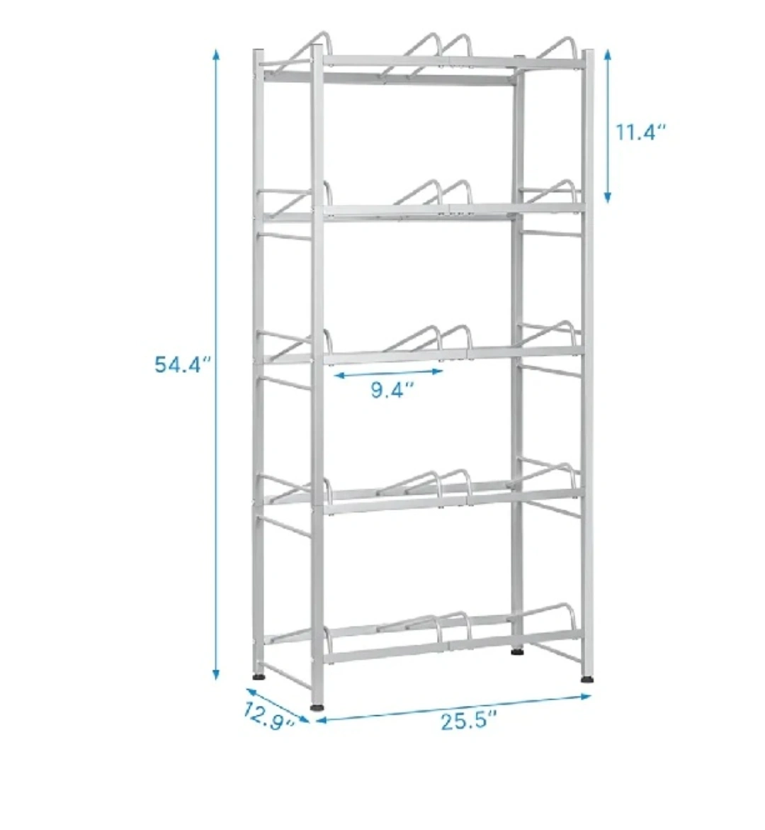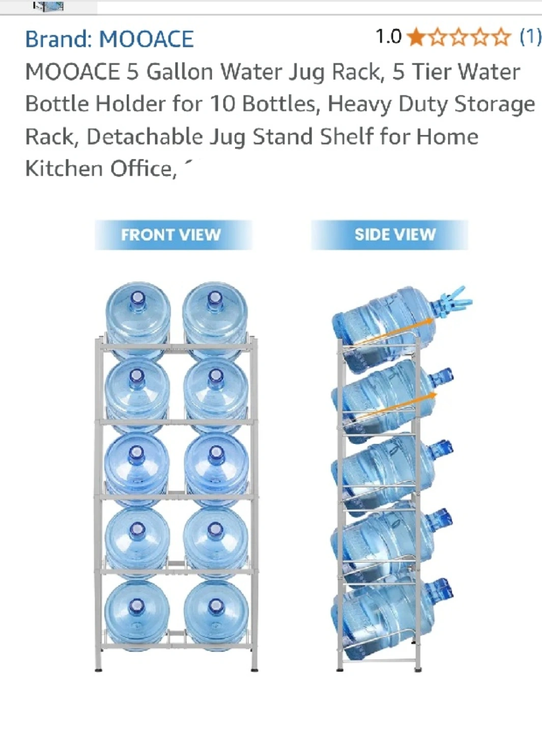 Brand New Selling a MOOACE 5-tier water bottle jug rack! It's a heavy-duty storage rack that can hold up to 10 bottles. The rack is detachable, making it easy to assemble and move. Perfect for home, kitchen, or office use! Dimensions are 54.4" in height, 25.5" in width, and 12.9" in depth
