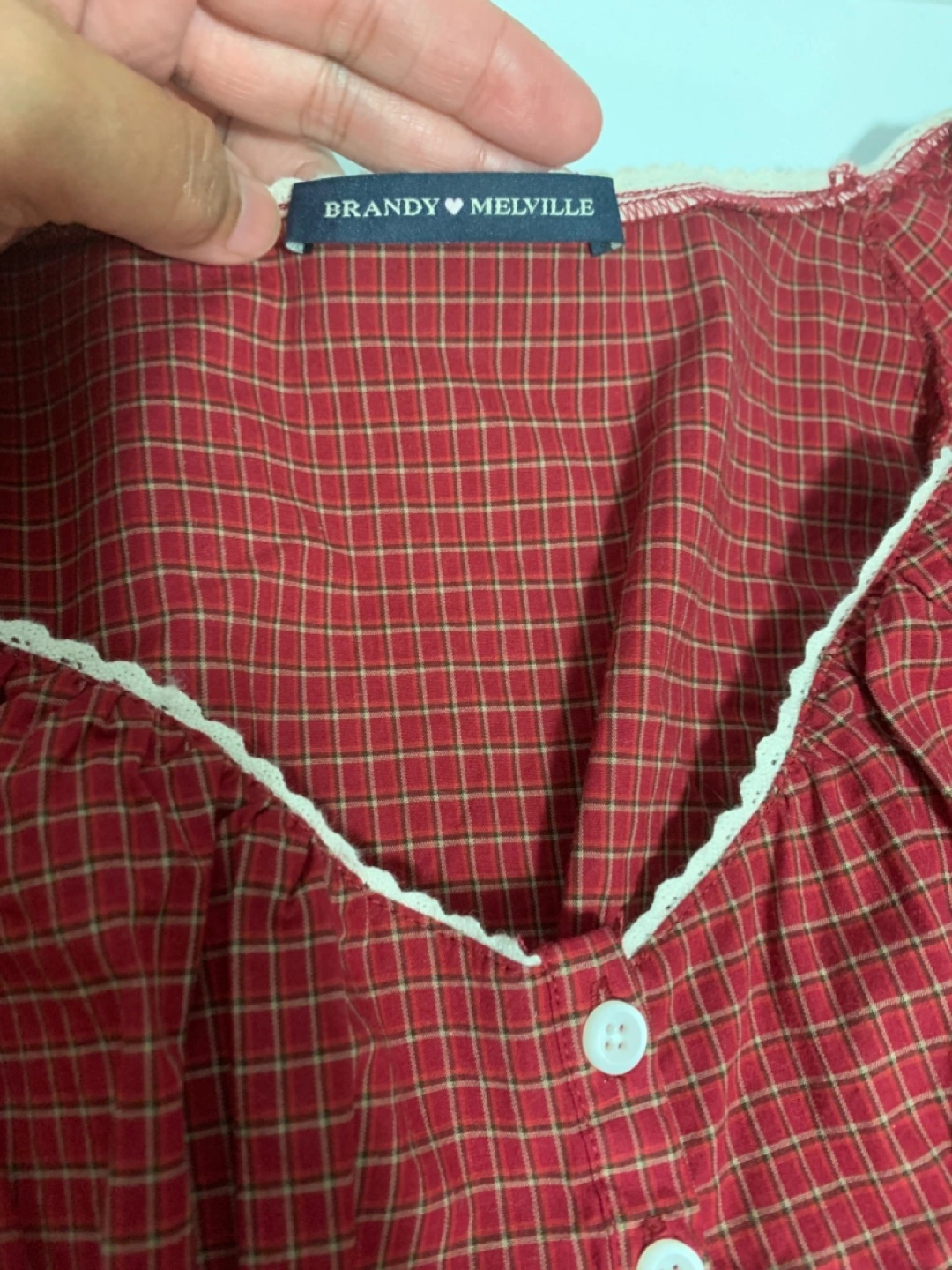 Selling a cute Brandy Melville top! It features a red and white plaid pattern, short sleeves, and a button-down front. The neckline is trimmed with delicate white lace. It's in great condition and perfect for adding a touch of vintage charm to your wardrobe