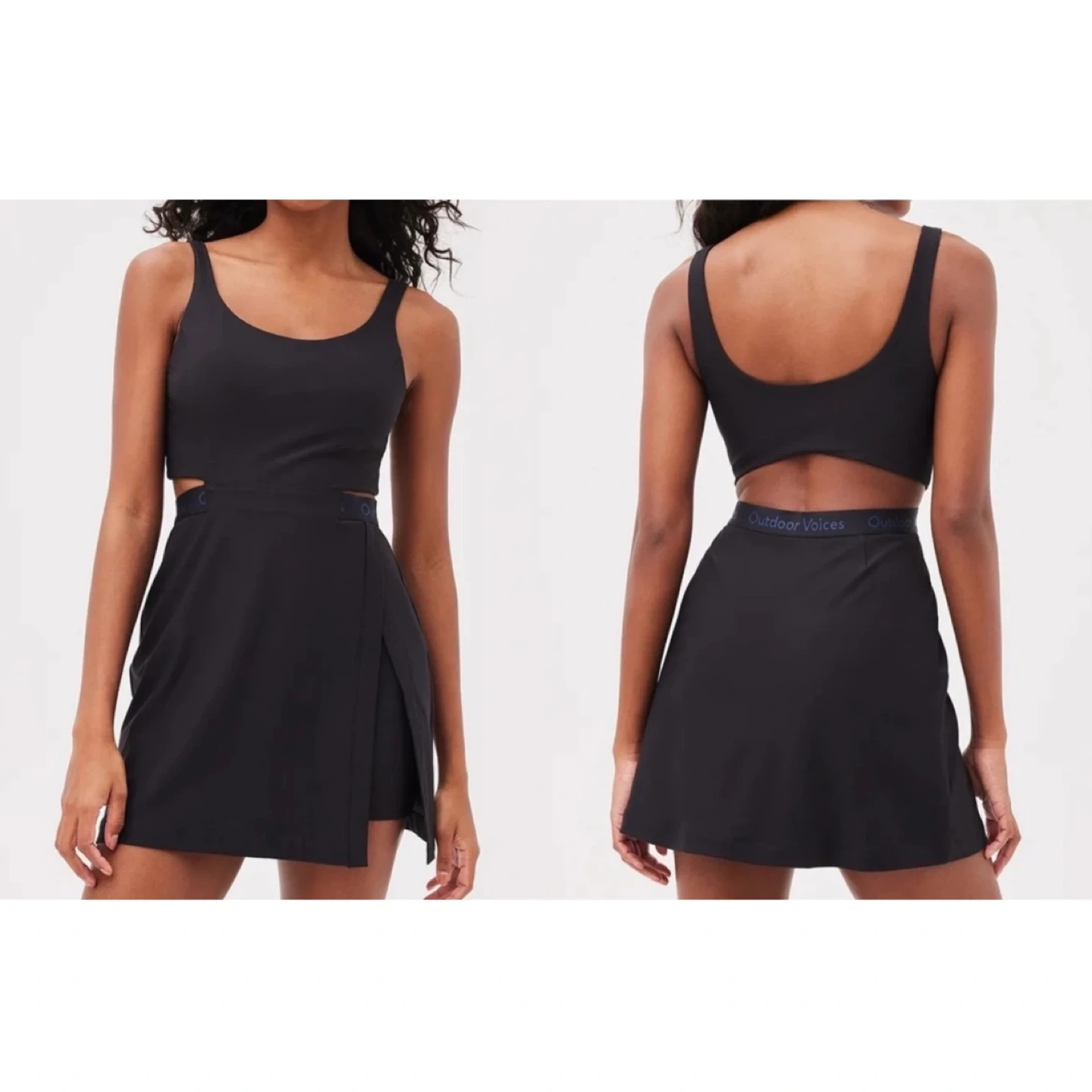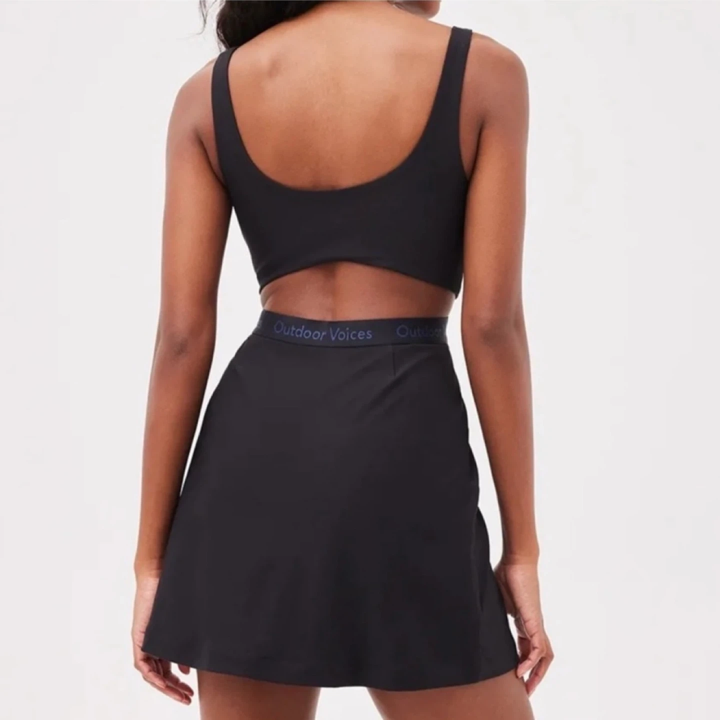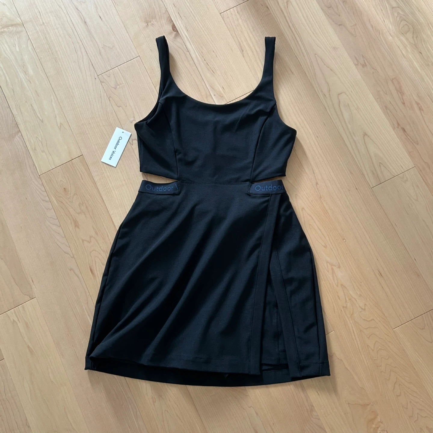 Scoop neck exercise dress in black with blue accented logo elastic at waist, peekaboo side/back cut-out, crossover skirt slit, and built-in shorts with pockets. No bra pads. Great for court sports or just on the daily. Originally $108 USD.