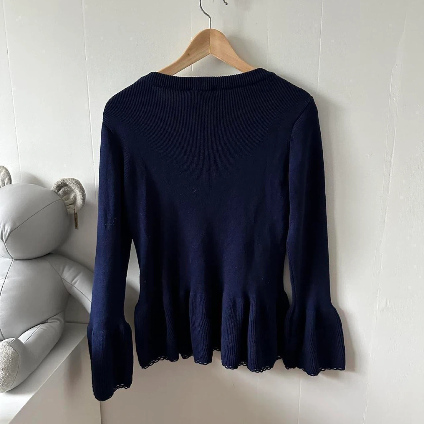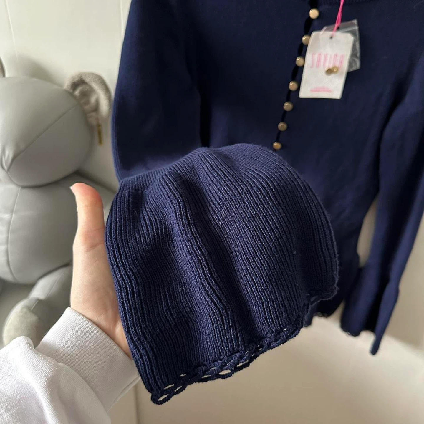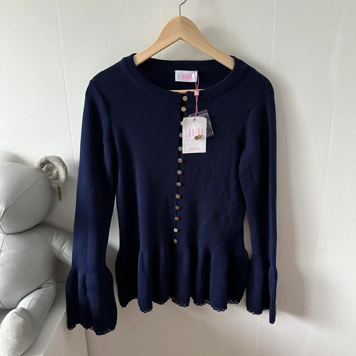 navy blue, button-up, bell sleeves, gold buttons, fitted, soft knit, feminine, casual chic, new with tags