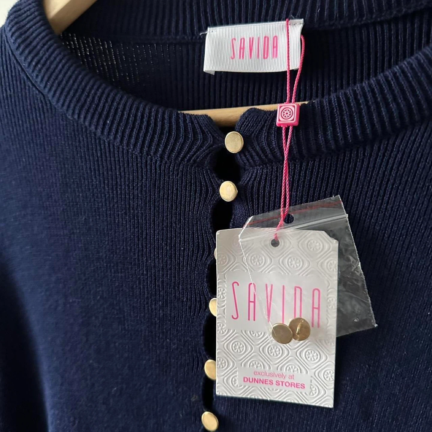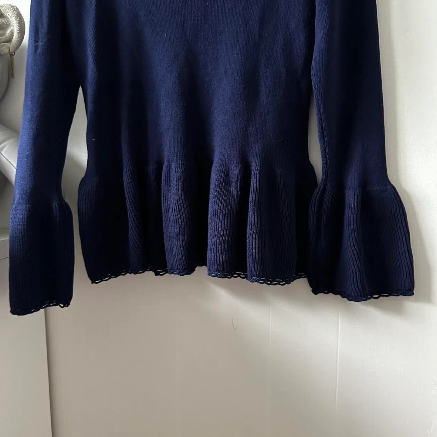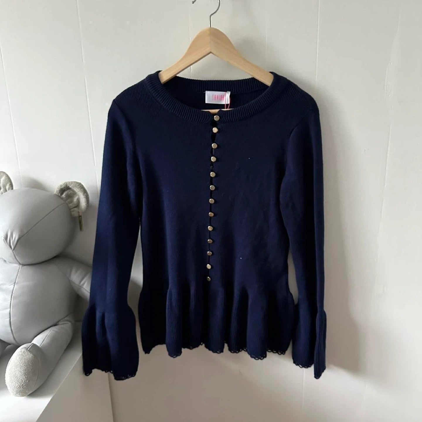 navy blue, button-up, bell sleeves, gold buttons, fitted, soft knit, feminine, casual chic, new with tags