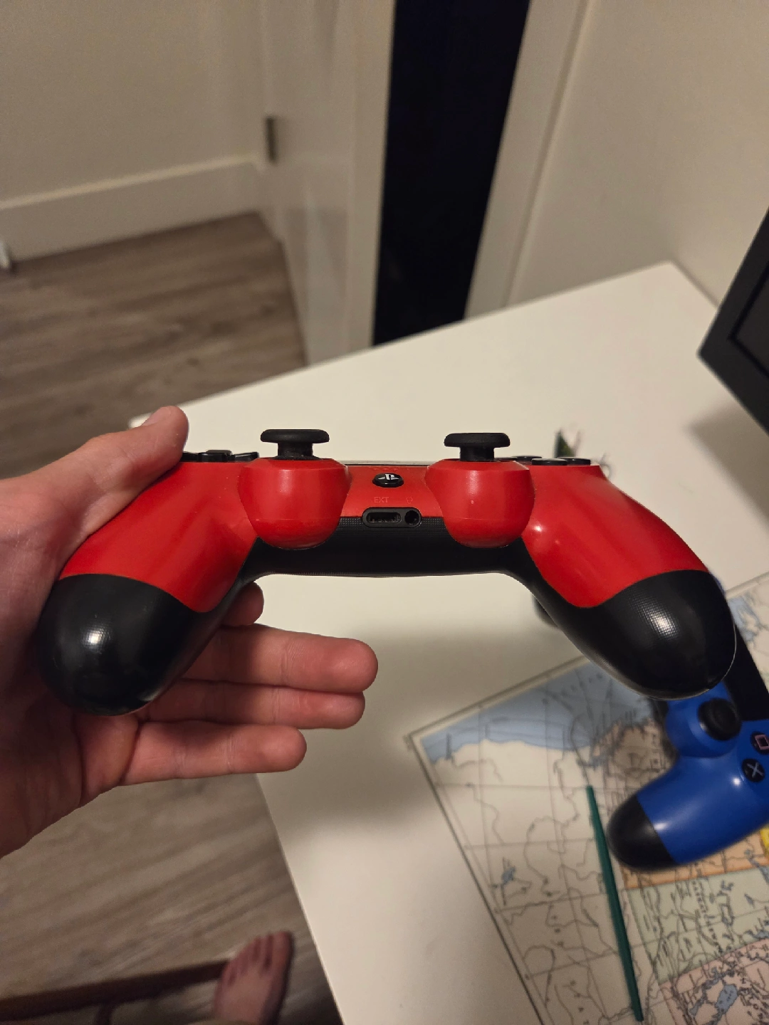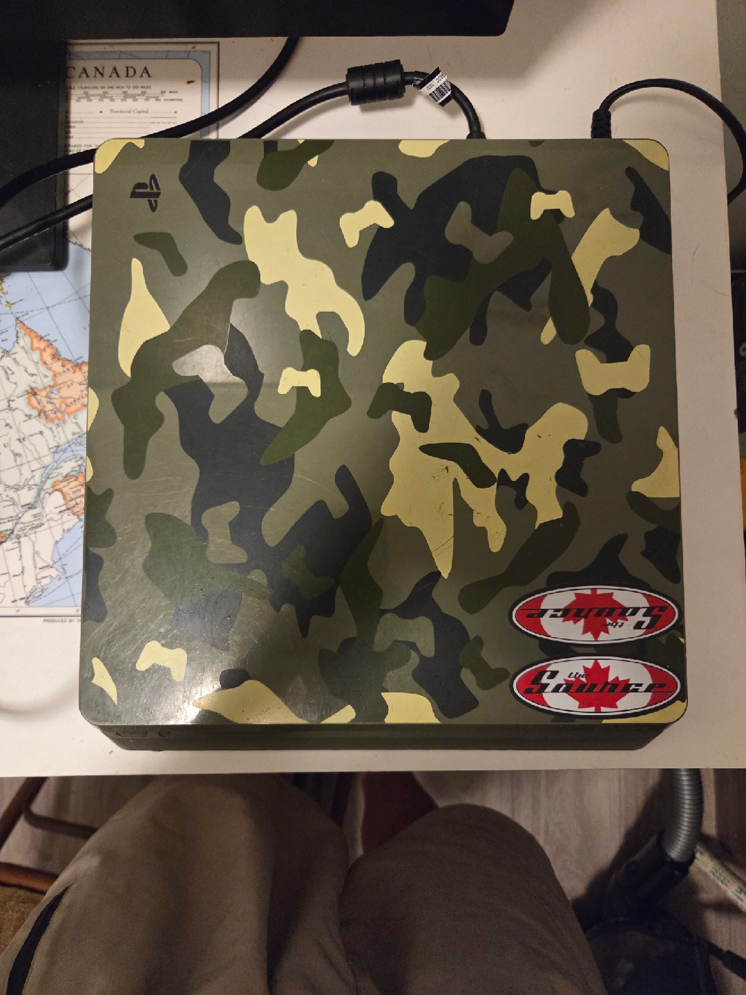 Selling a PlayStation 4 Slim with a cool camo design! It comes with a red DualShock 4 controller. Perfect for gaming!
