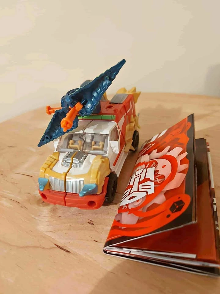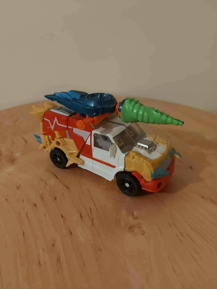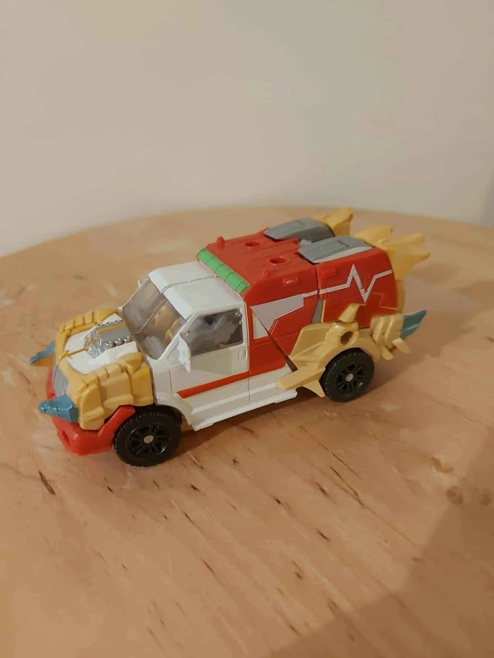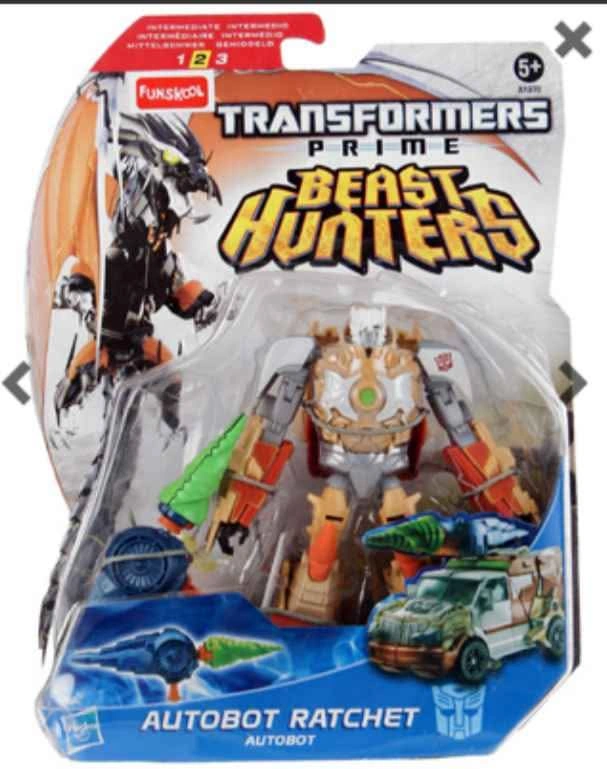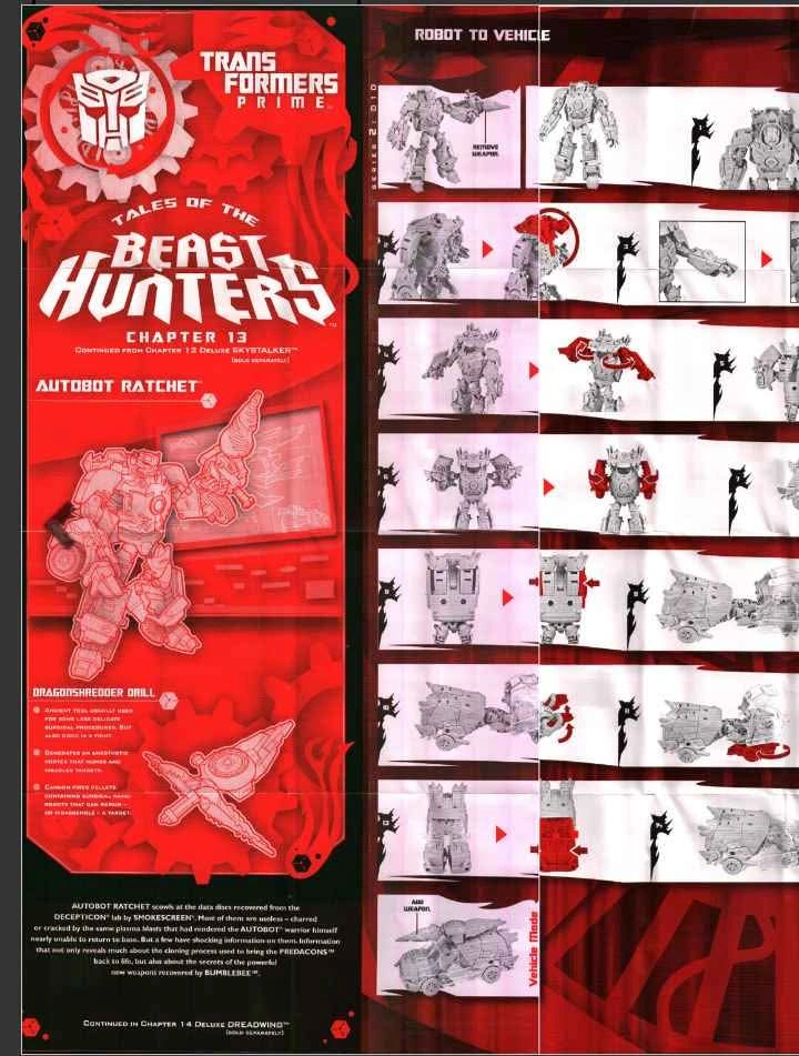 10Part of the third wave of Prime: Beast Hunters Deluxe Class toys, "Autobot Ratchet" is a redeco and extensive retool of the Robots in Disguise Deluxe Class Autobot Ratchet toy, transforming into a heavily modified rescue vehicle that's covered with spikes. Instructions are included.