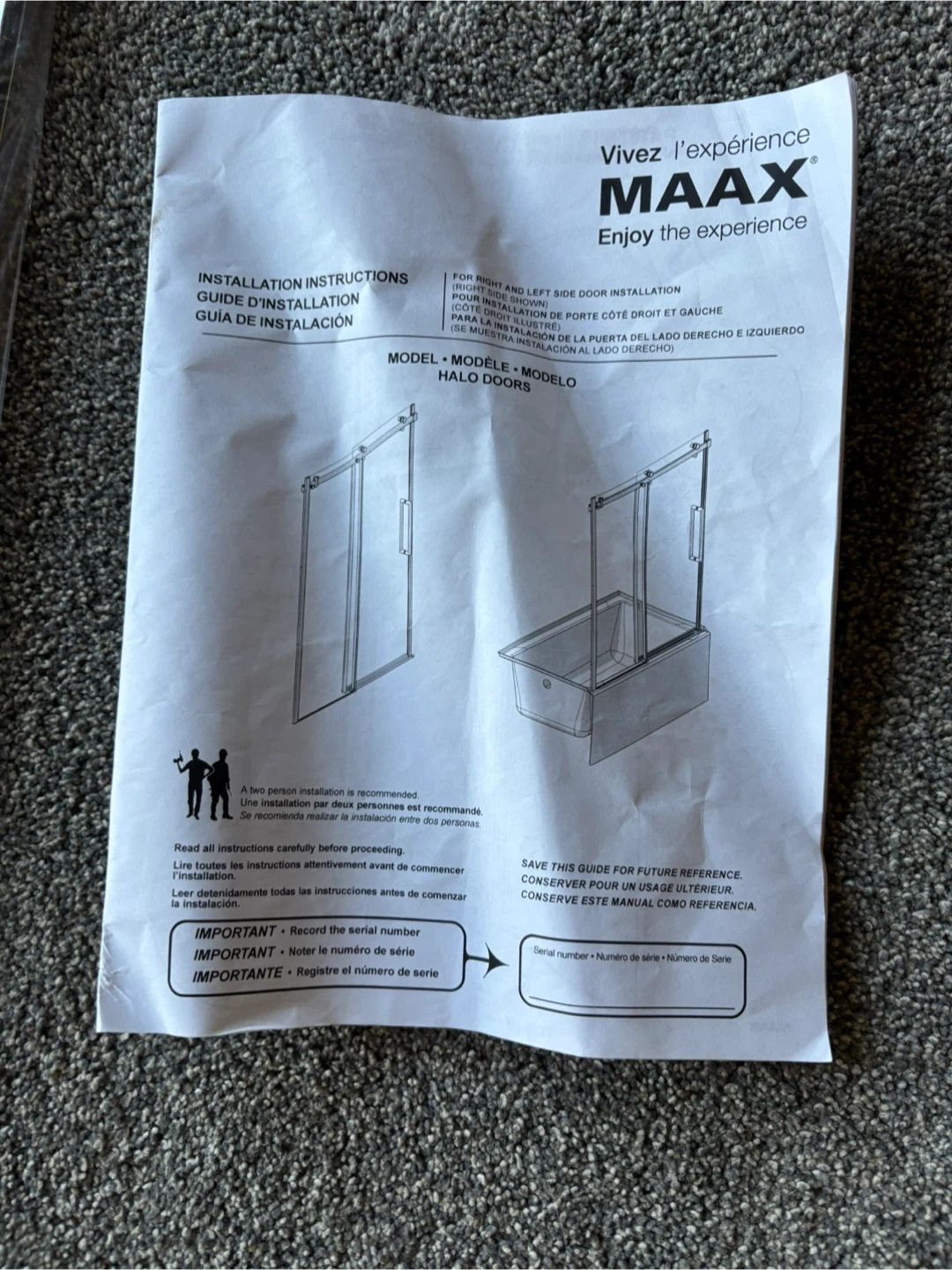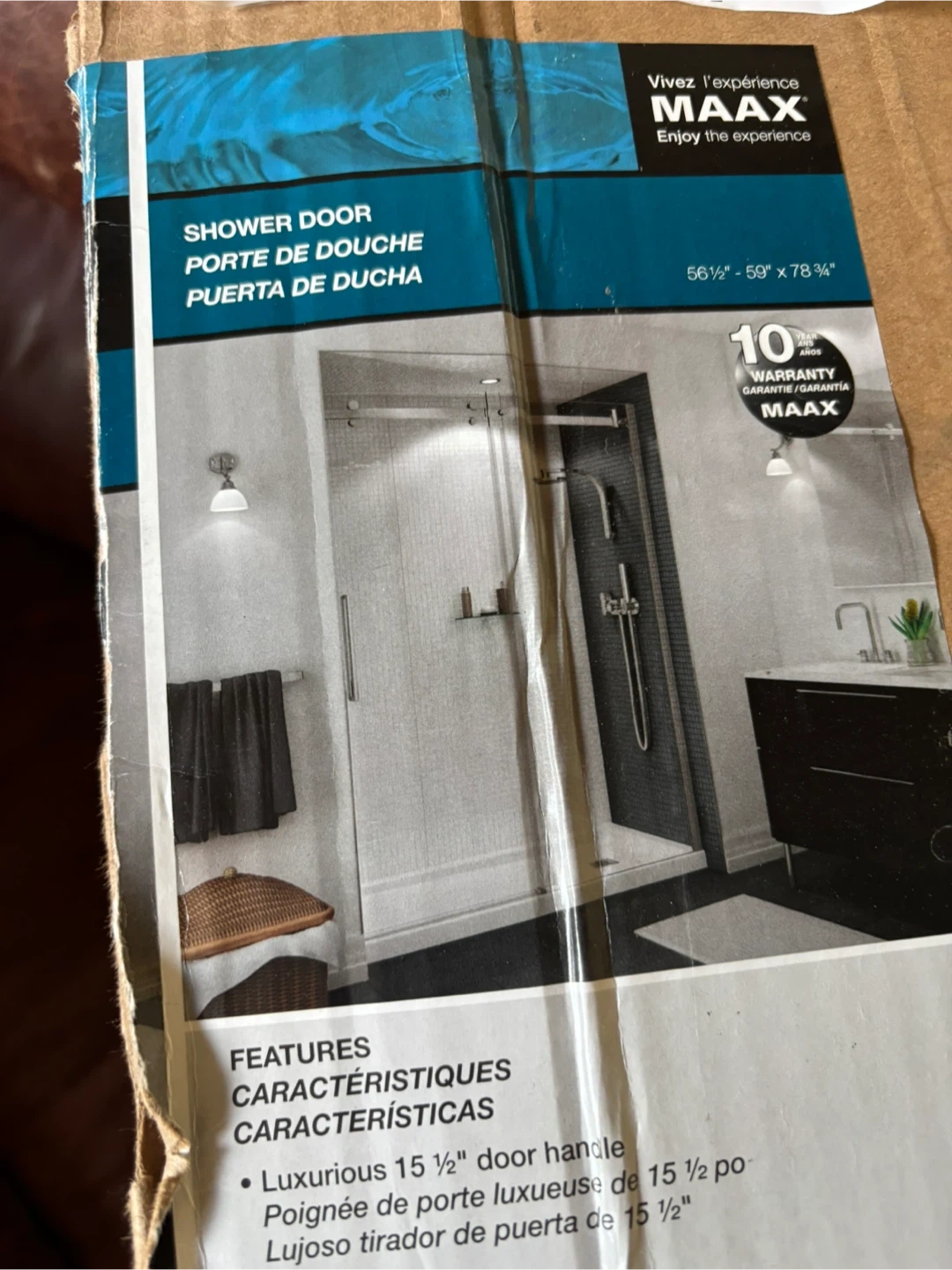 Selling a MAAX Halo shower door. It's designed for right or left-hand sliding. The door measures 56 1/2"-59" x 78 3/4". It also comes with a luxurious 15 1/2" door handle and all the installation instructions