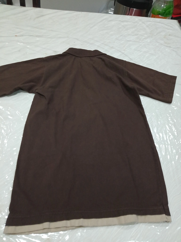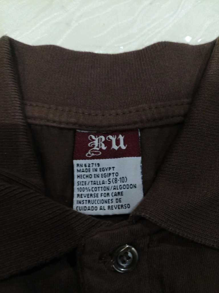 Selling a RVU polo shirt in size S (8-10). It's a nice brown colour and made of 100% cotton. There is a design on the front of the shirt.