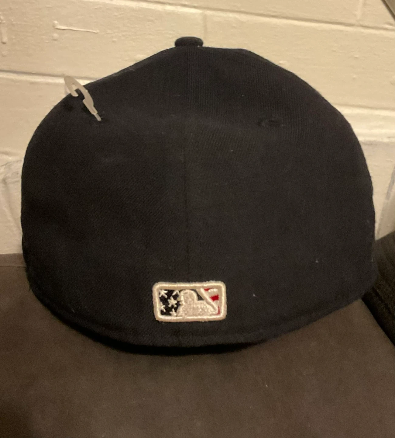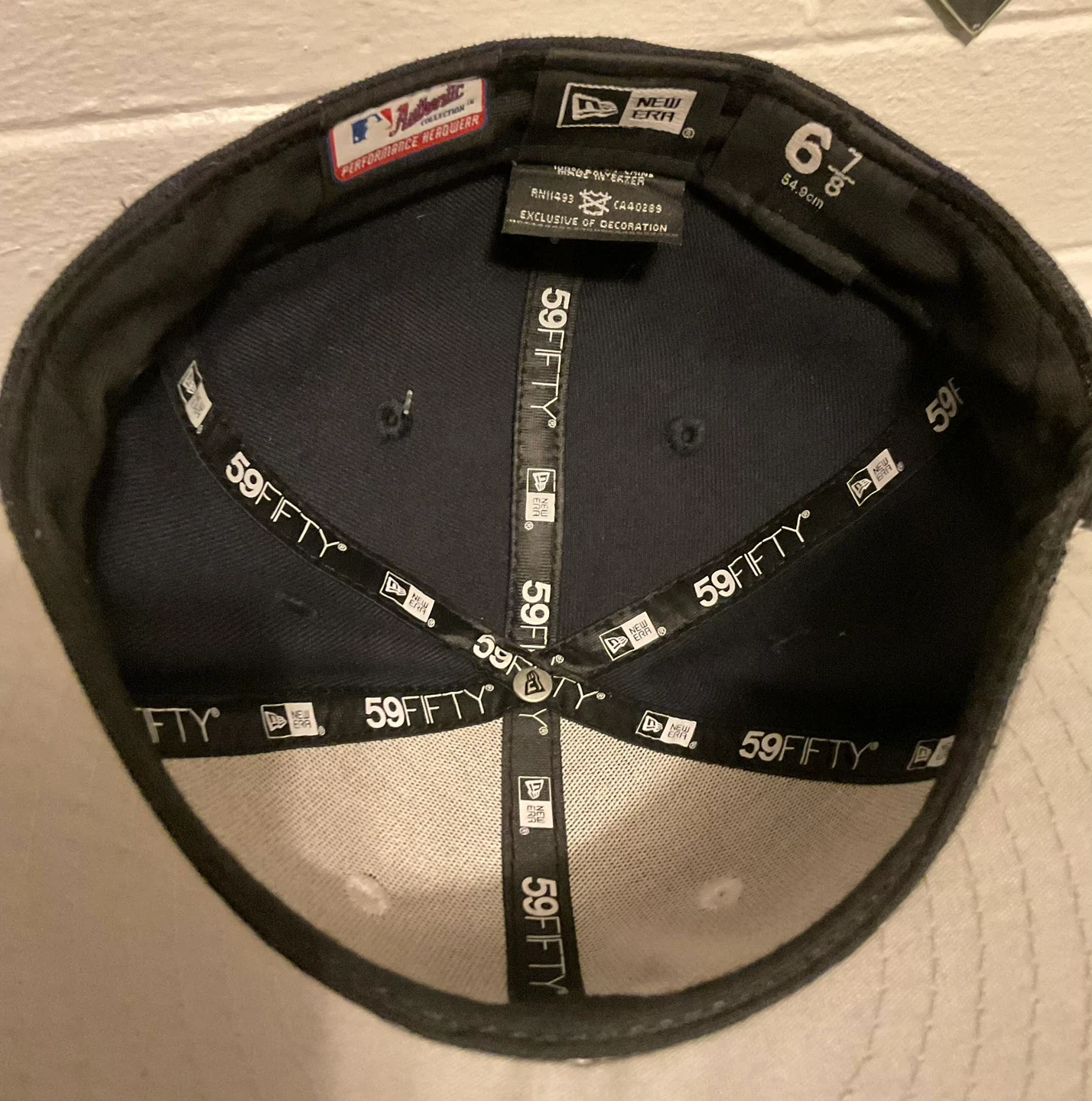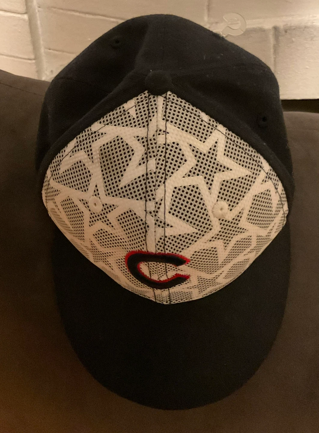 Selling a New Era 59FIFTY Chicago Cubs hat. It's a size 6 7/8. The hat is black with a white star pattern on the front and a red 'C' logo. It also has a MLB Authentic logo.
