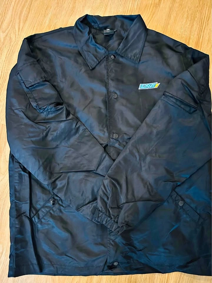 Black coach jacket with seasonal "ARCHIVES" print across the upper back. Features two zippered pockets on the sleeves and two pockets at the waist. Finished with a spread collar, rubber logo patch and frontal button fastening. Size: XL. Let me know if you're interested!