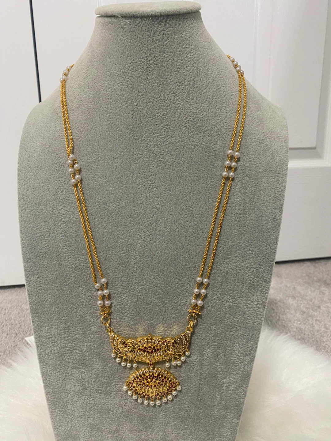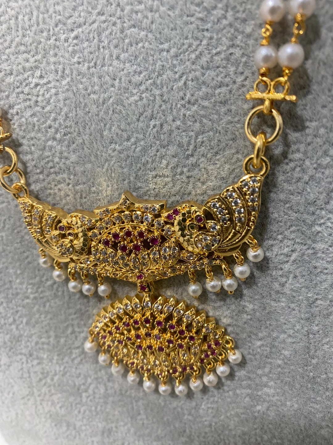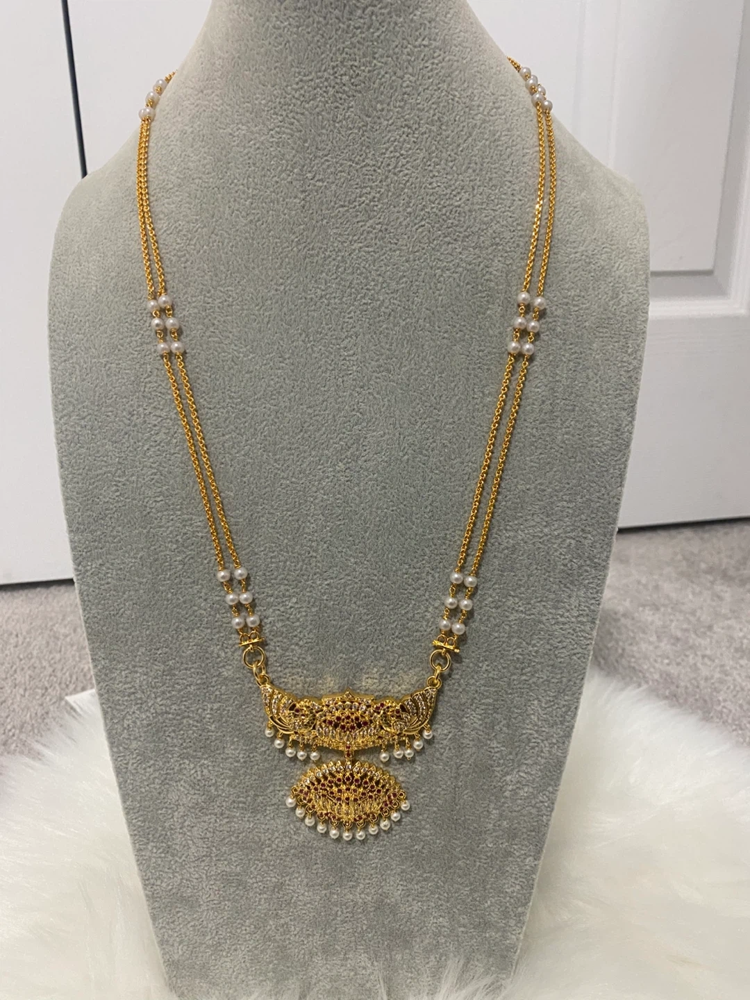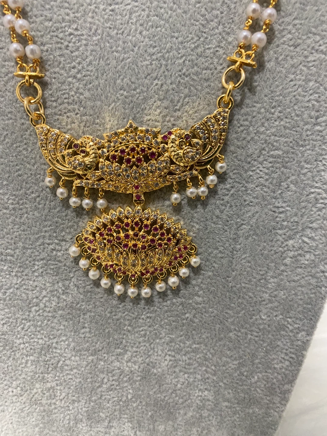 28This is a beautiful gold-toned necklace featuring intricate detailing and pearl accents. It's in great condition and would be a lovely addition to any jewelry collection!