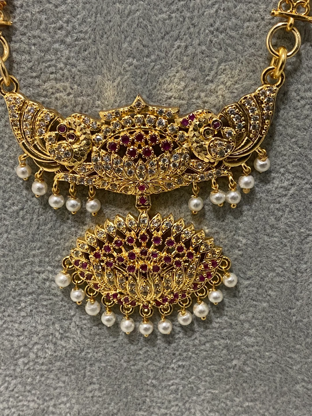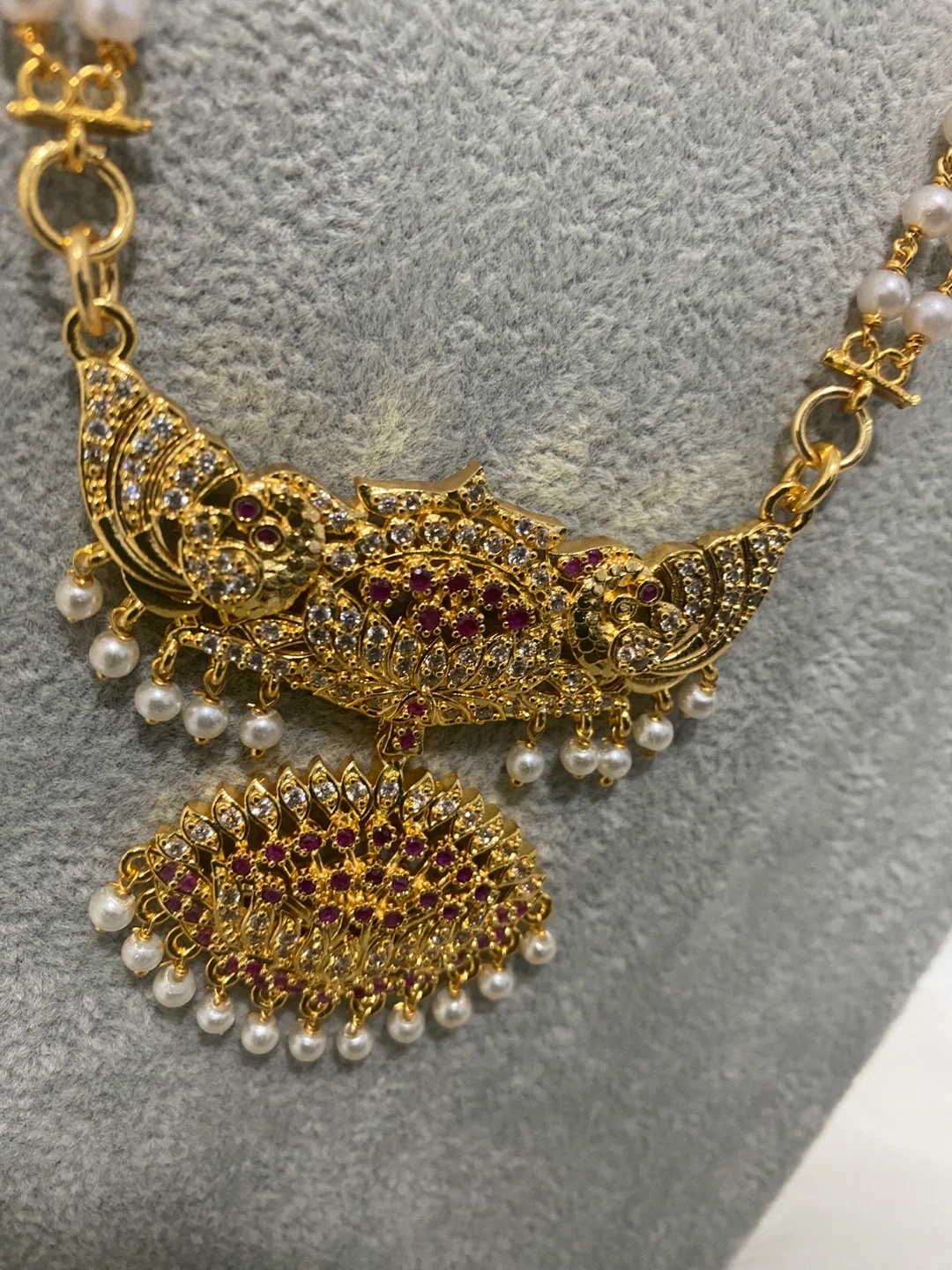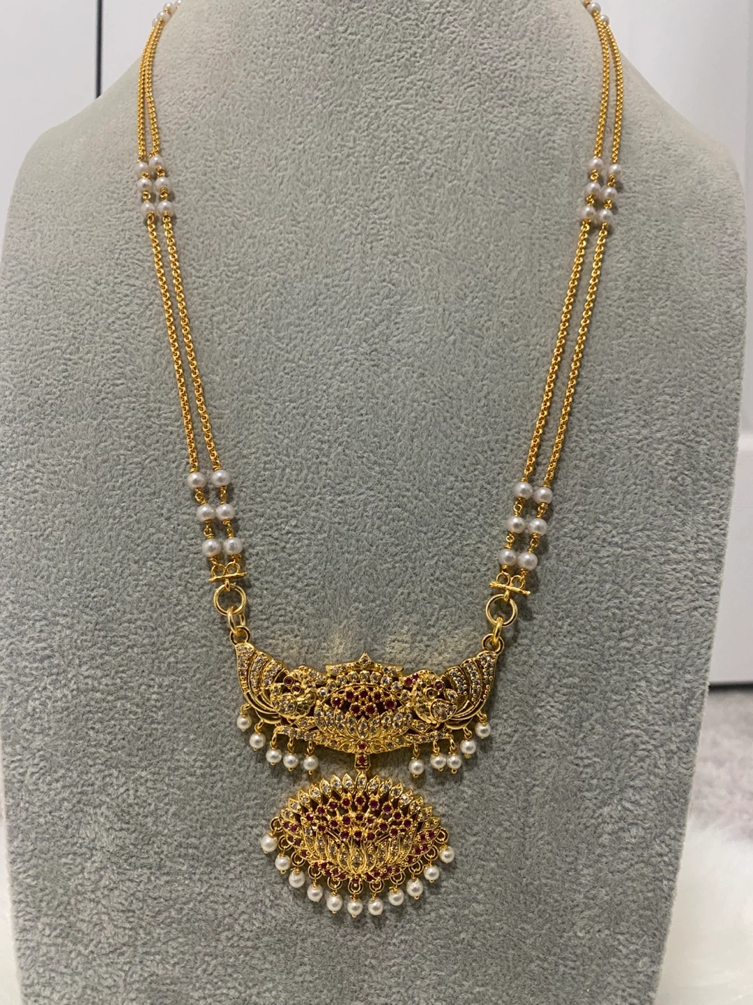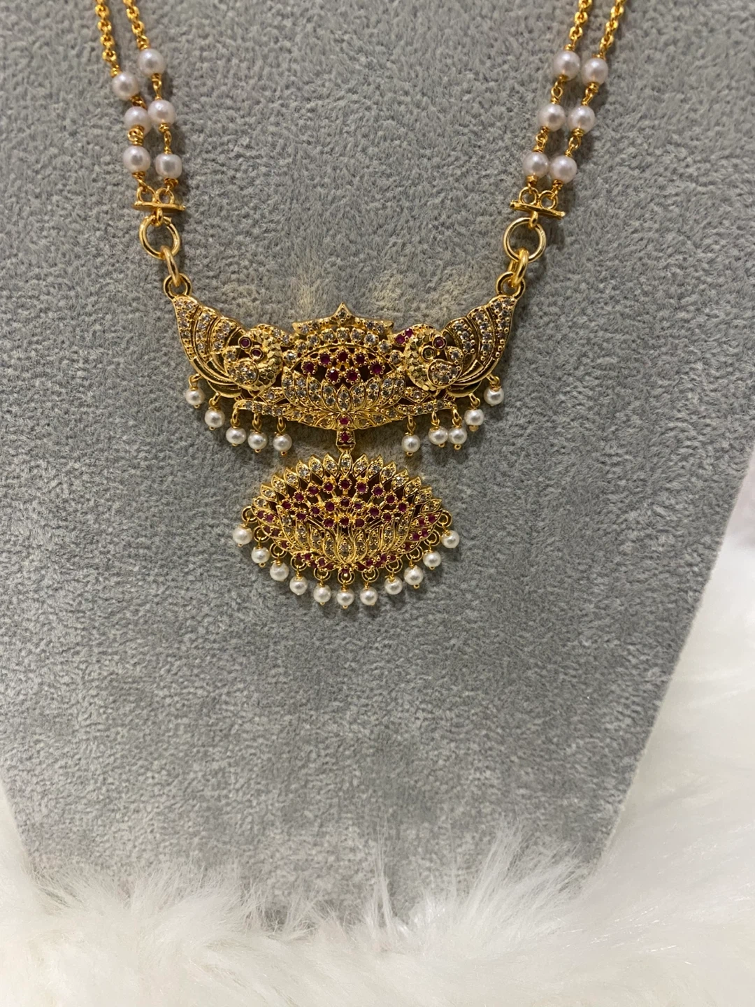 28This is a beautiful gold-toned necklace featuring intricate detailing and pearl accents. It's in great condition and would be a lovely addition to any jewelry collection!