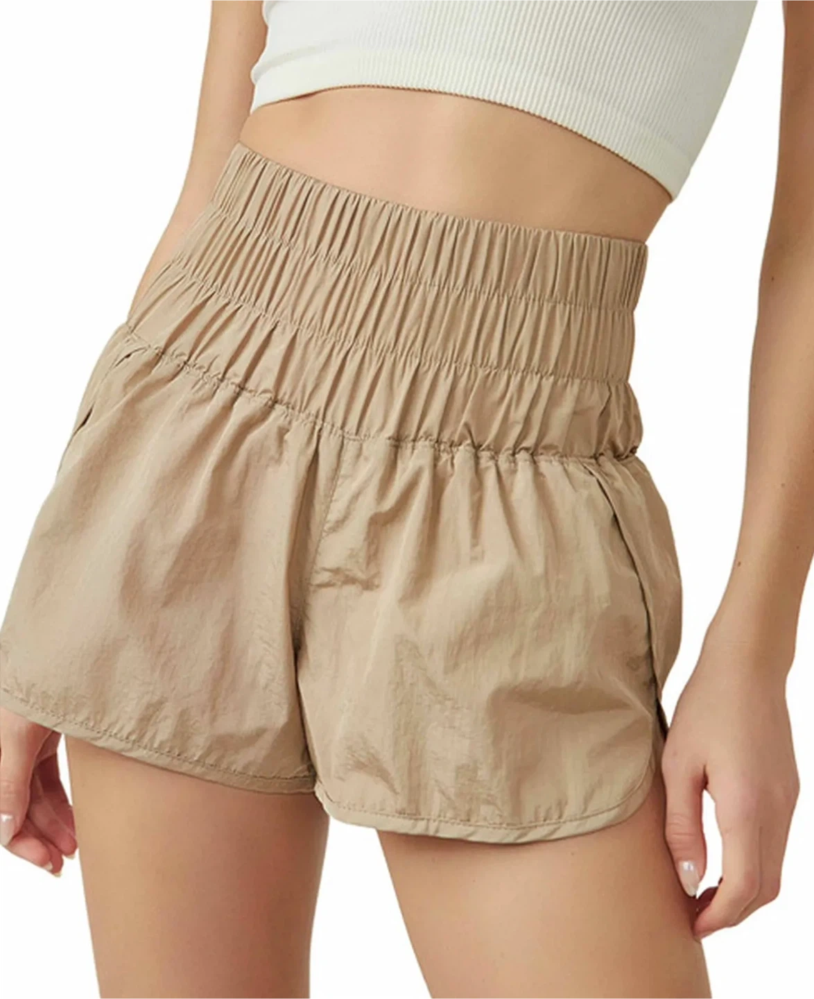 FP (Free People) Movement breezy, warm-up style running shorts in beige. Features a high-rise boldly smocked waistband, curved split hemline, mesh key pocket at back, and built-in brief. 100% nylon material that is water-resistant. Originally $30 USD.