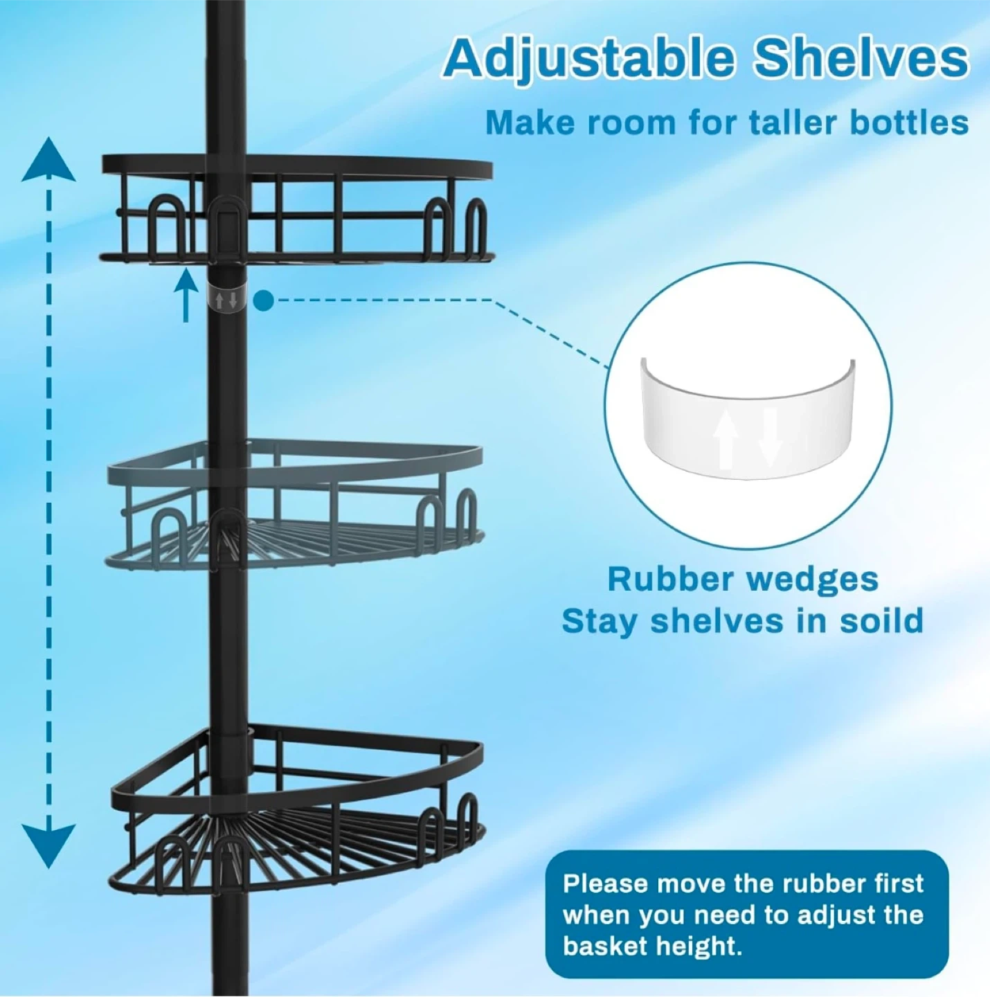 This adjustable tension corner shower caddy is perfect for organizing your shower essentials! It features adjustable shelves to accommodate taller bottles, rubber wedges to keep the shelves in place, and a large capacity to hold 3-7 bottles of various sizes per basket. It also comes with 2 towel bars for washcloths, a removable small basket with compartments, and 2 double hooks for a loofah or razor