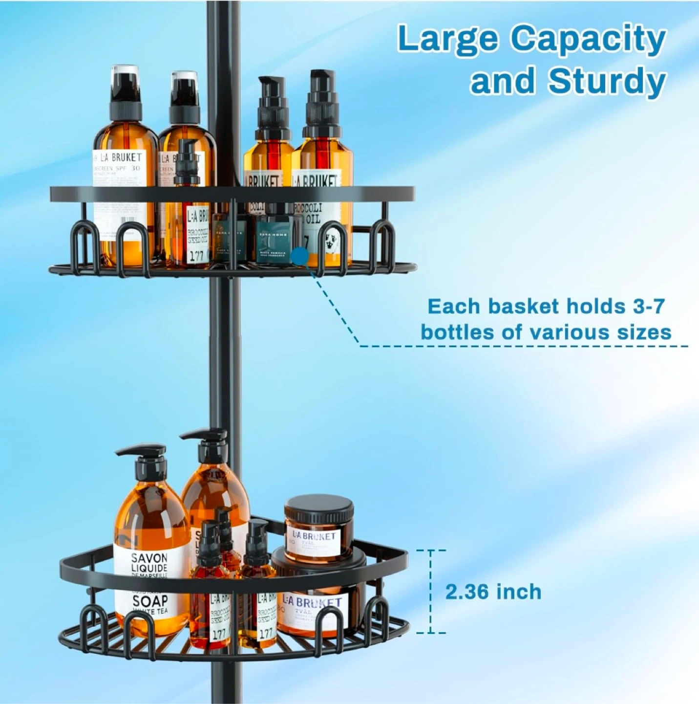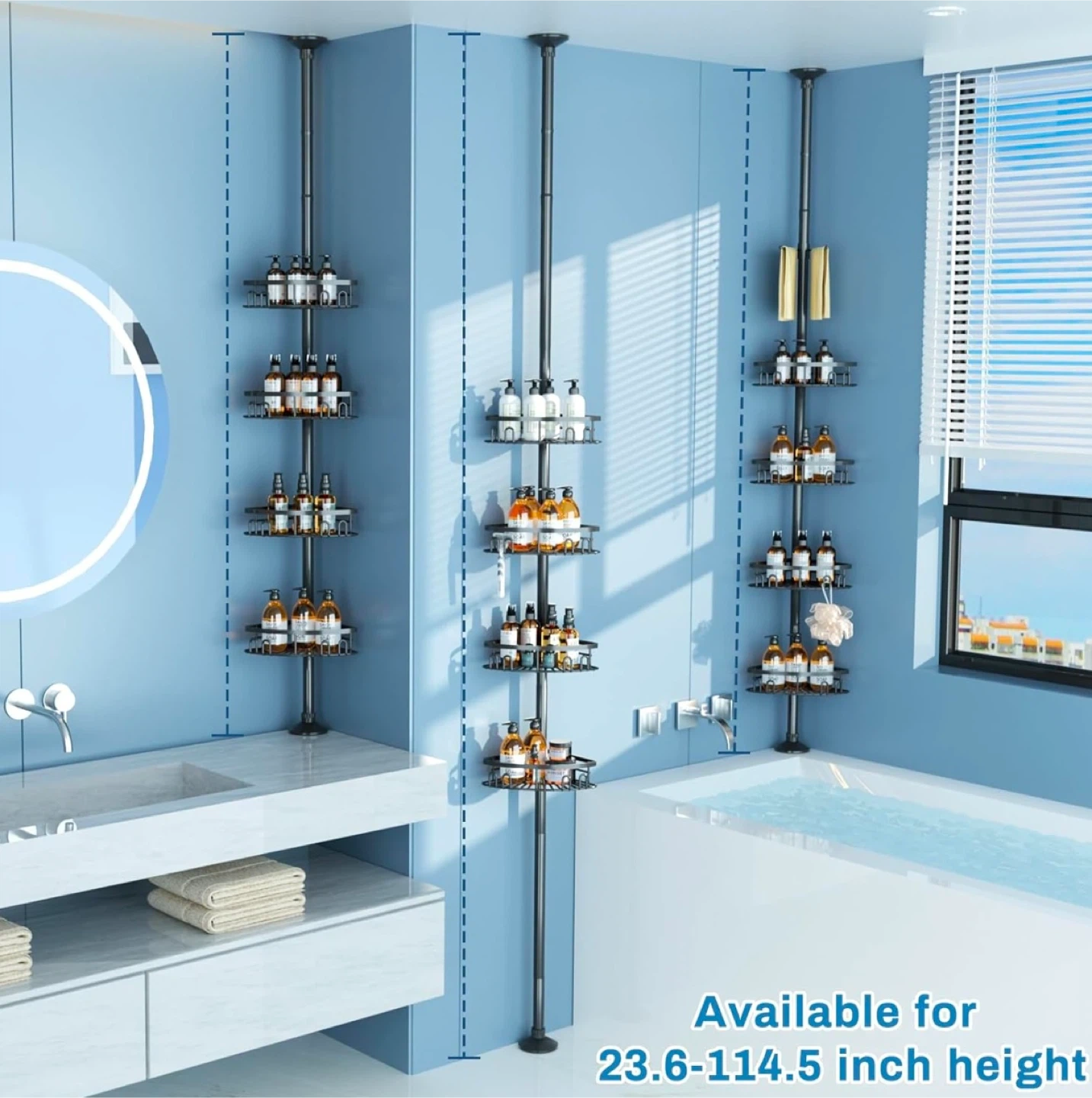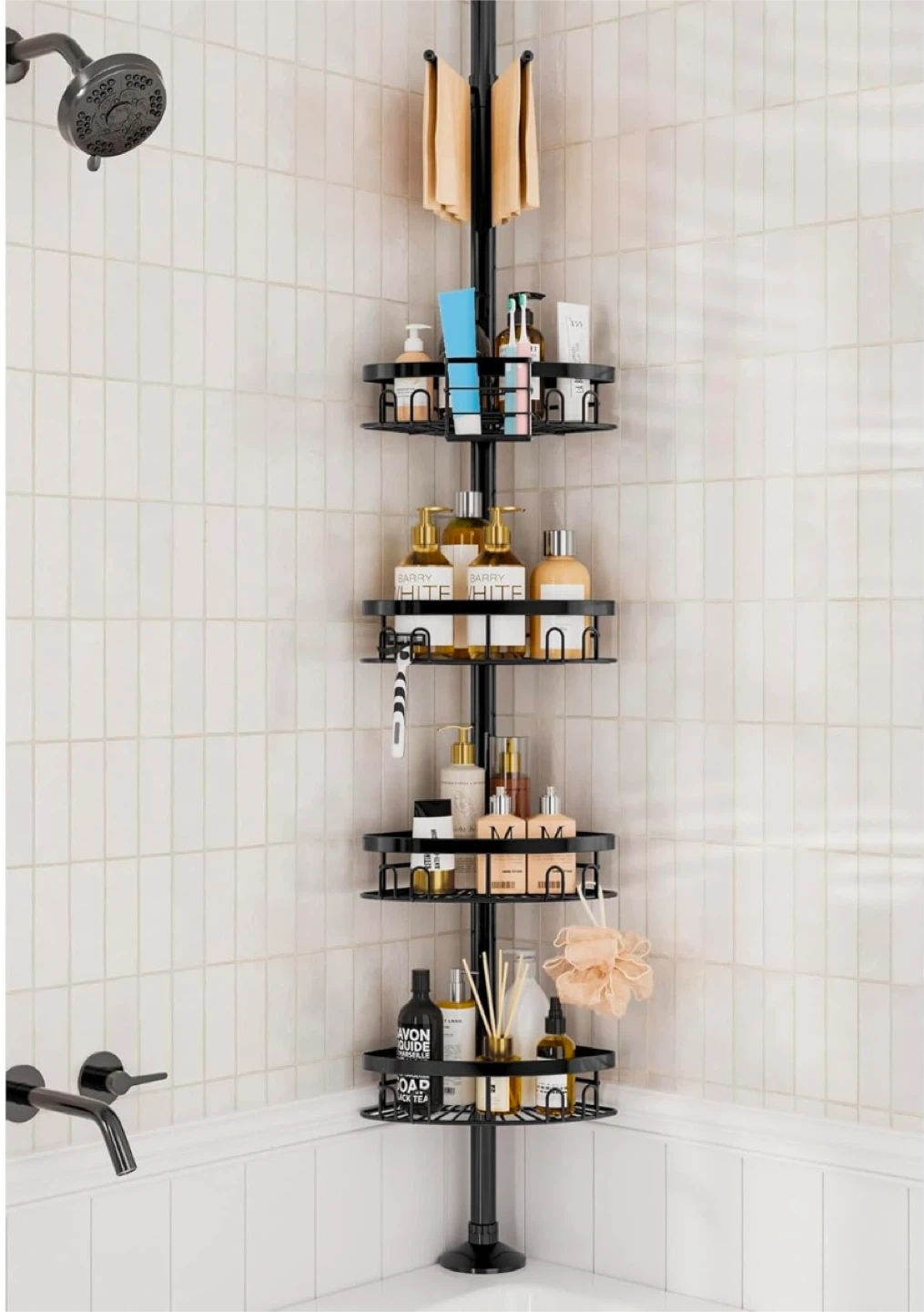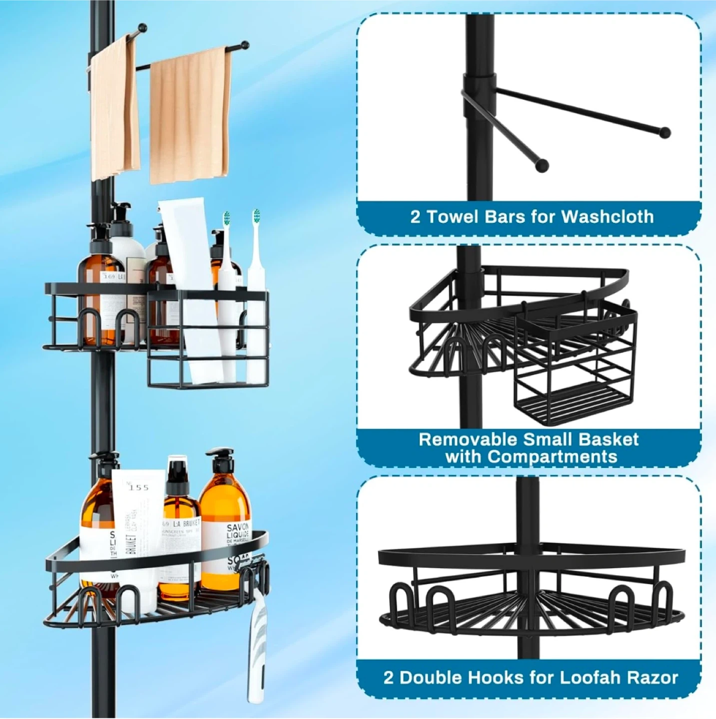 This adjustable tension corner shower caddy is perfect for organizing your shower essentials! It features adjustable shelves to accommodate taller bottles, rubber wedges to keep the shelves in place, and a large capacity to hold 3-7 bottles of various sizes per basket. It also comes with 2 towel bars for washcloths, a removable small basket with compartments, and 2 double hooks for a loofah or razor