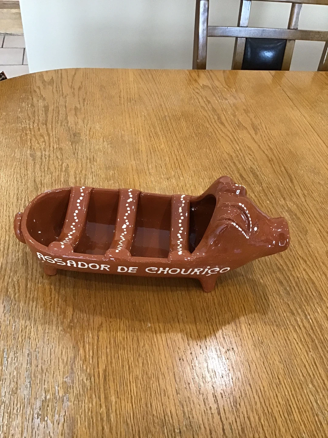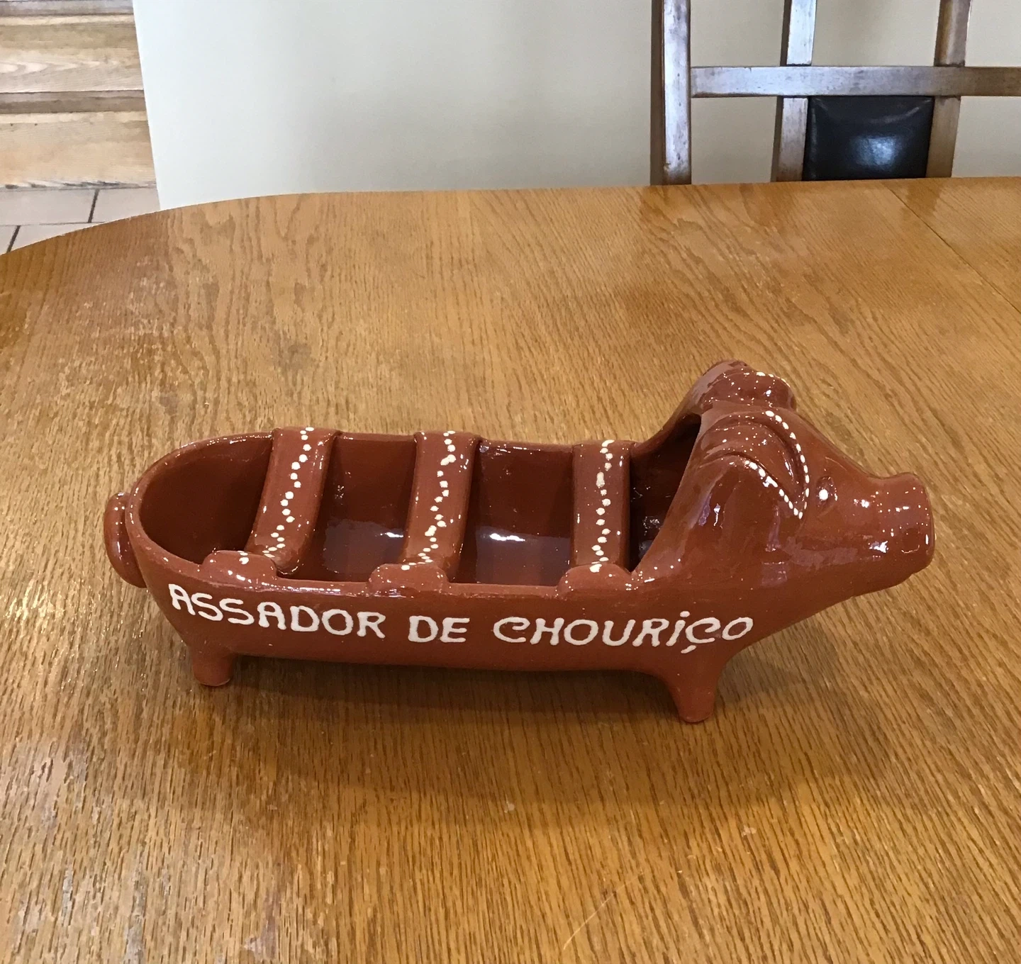 This is a traditional Portuguese Assador de Chouriço, perfect for roasting chorizo! It's shaped like a cute little pig and has a rustic, earthenware look. The text on the side says "ASSADOR DE CHOURIÇO". It's in great condition and ready to bring some Portuguese flair to your cooking.
