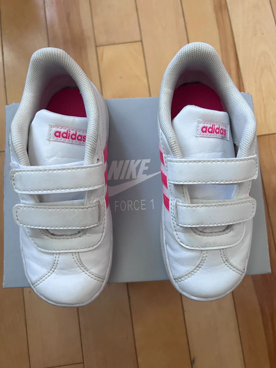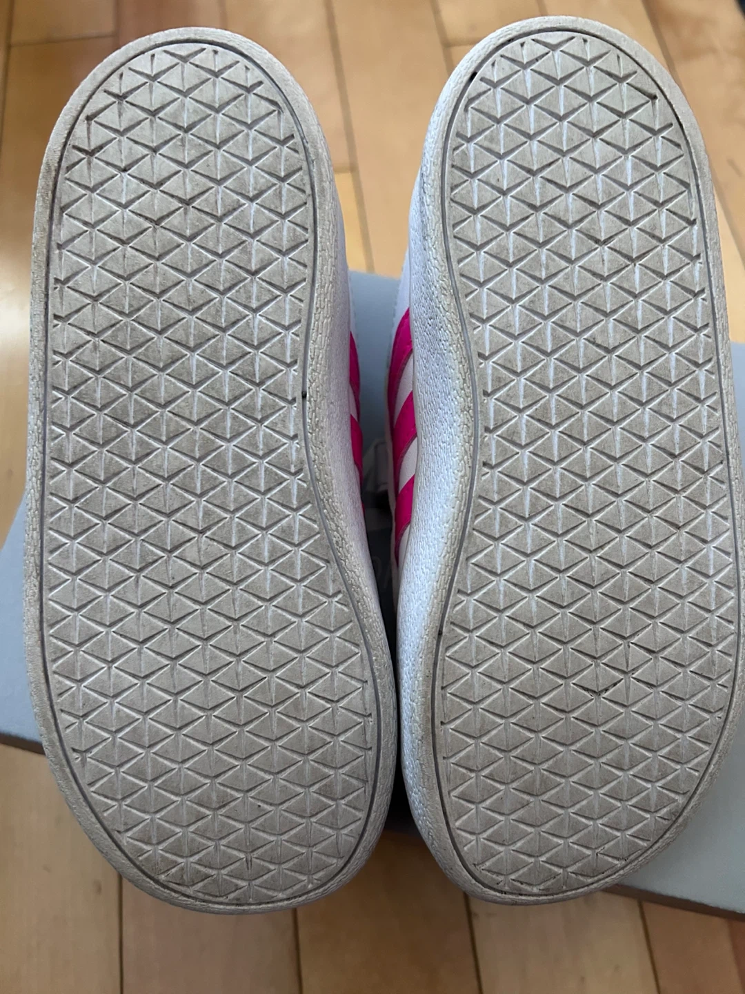 These adorable Adidas Court 2.0 shoes are perfect for your little one! They're in great shape and ready for a new home. The shoes are a size 9K in US sizing, and feature a classic white design with pink accents. They come with the original box!