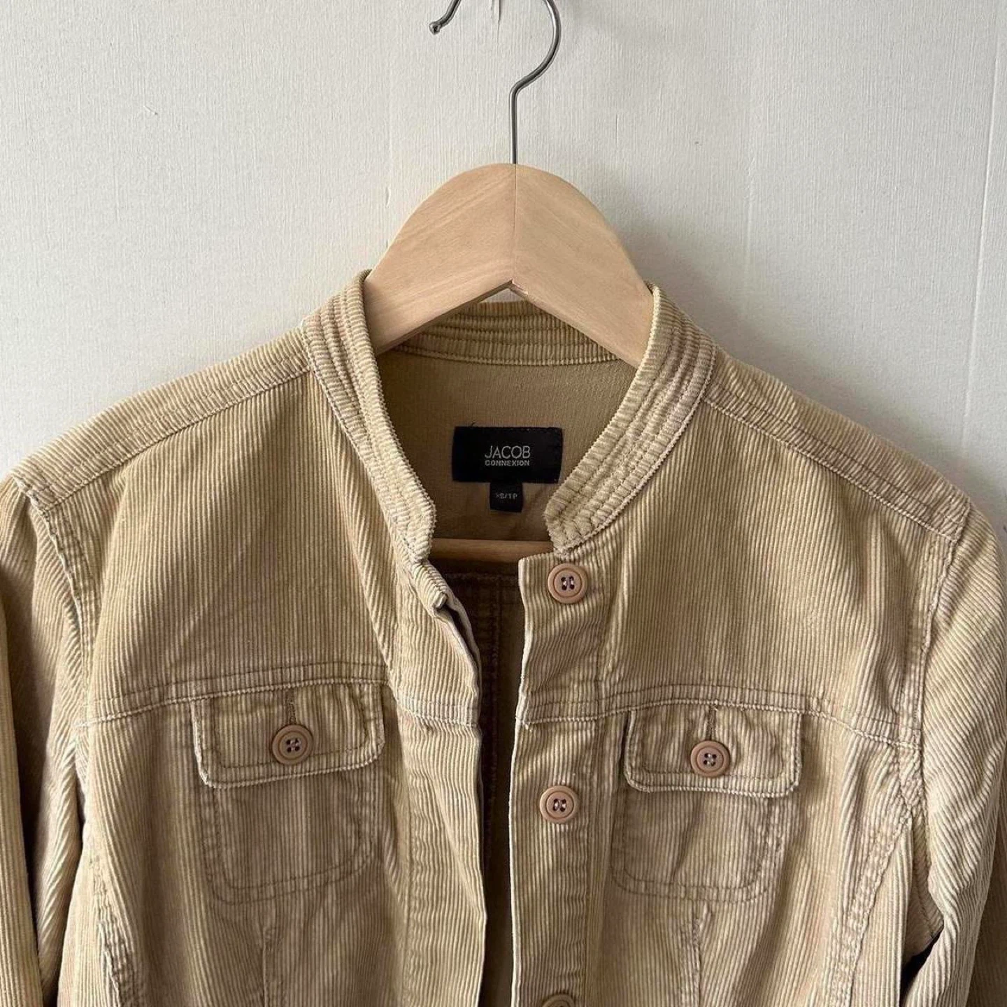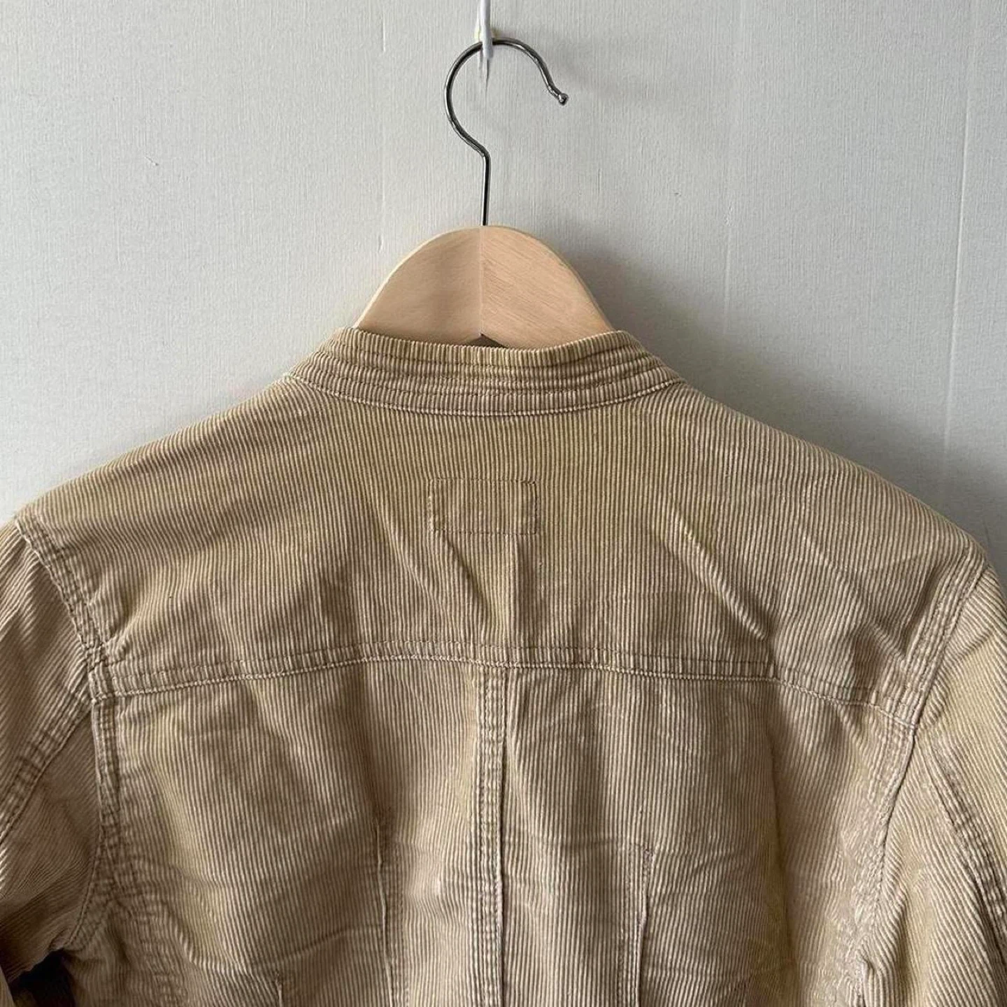 tan corduroy, vintage jacket, button-up, textured fabric, casual outerwear, neutral tones, retro style, lightweight, classic fit