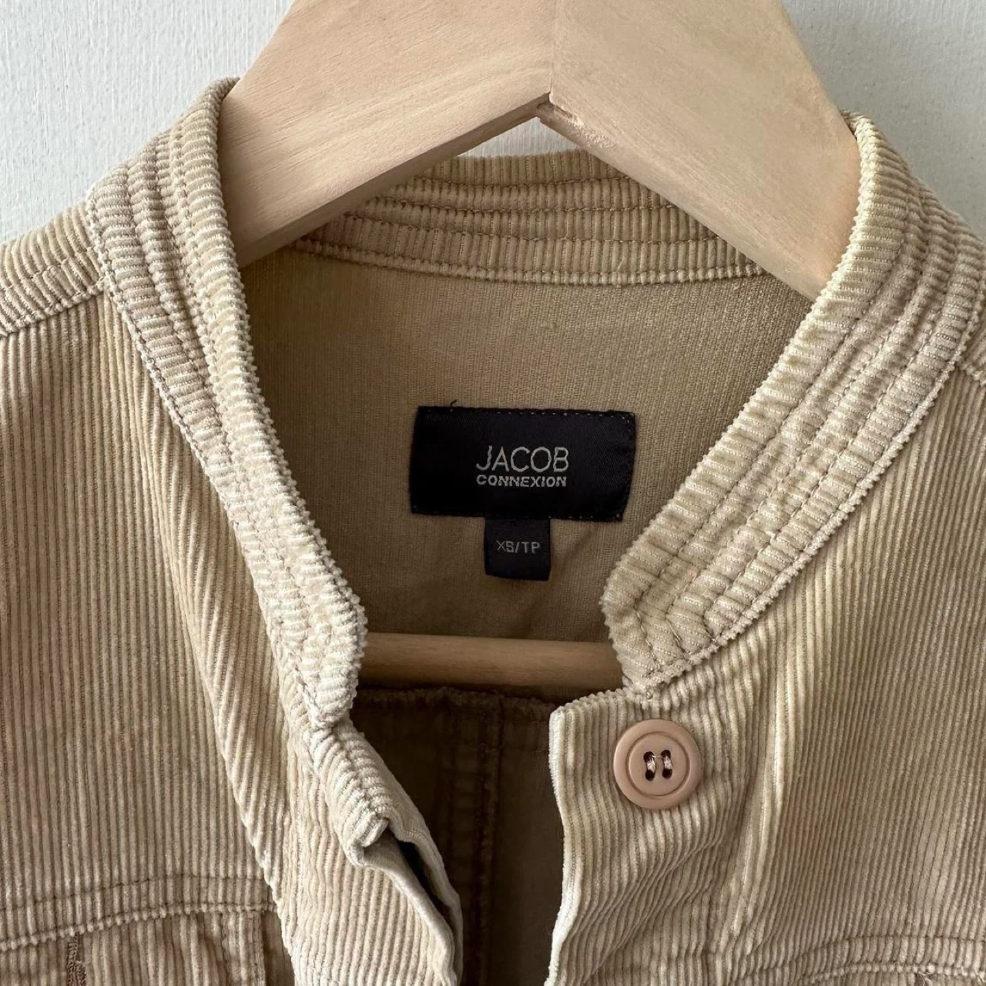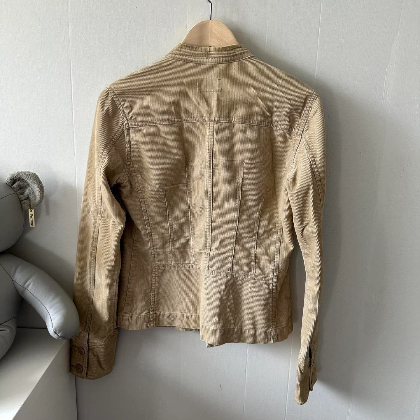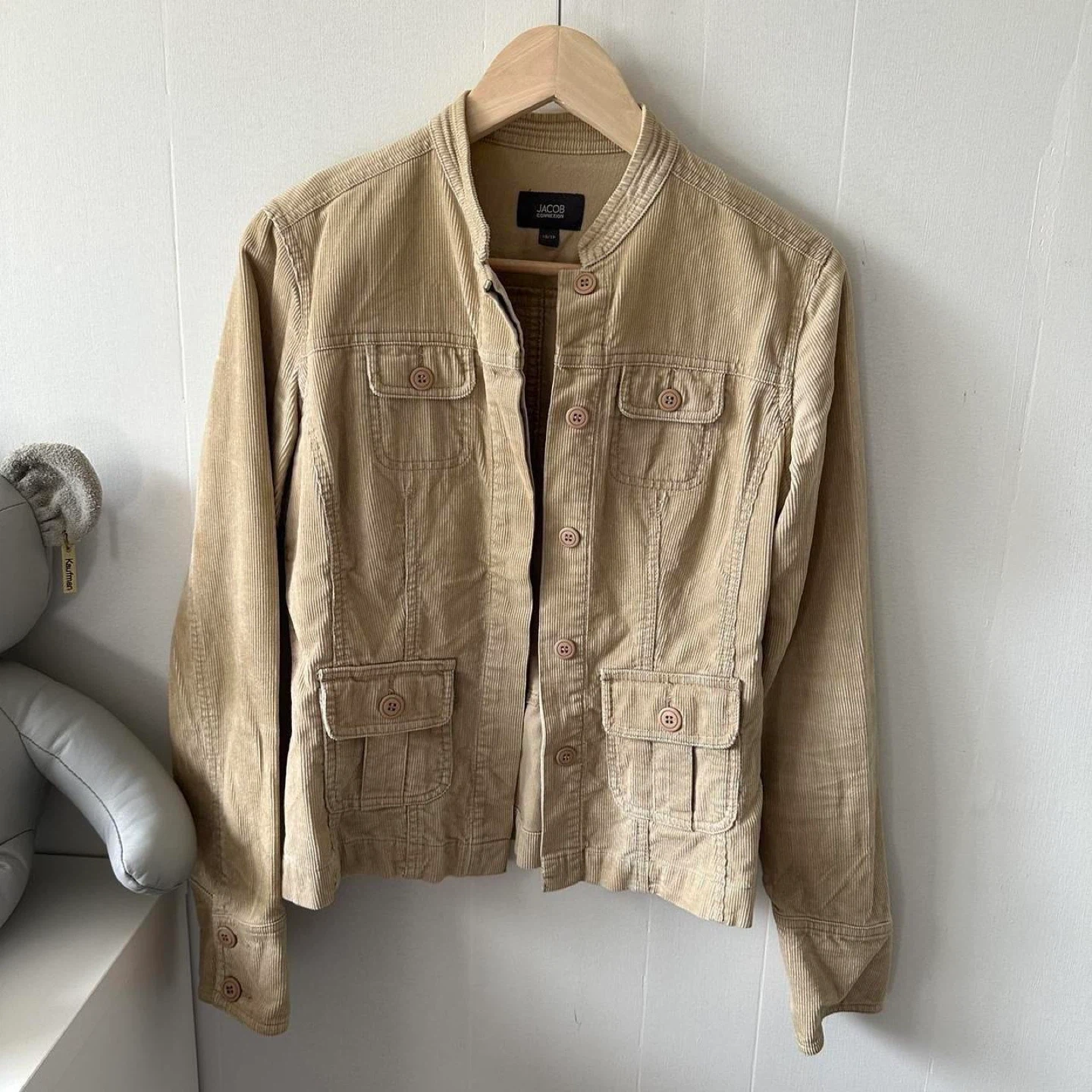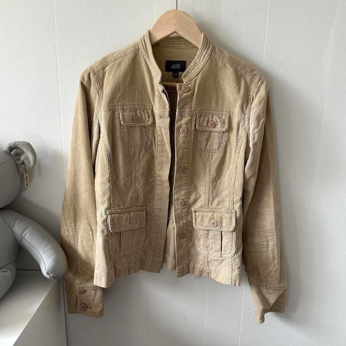 tan corduroy, vintage jacket, button-up, textured fabric, casual outerwear, neutral tones, retro style, lightweight, classic fit