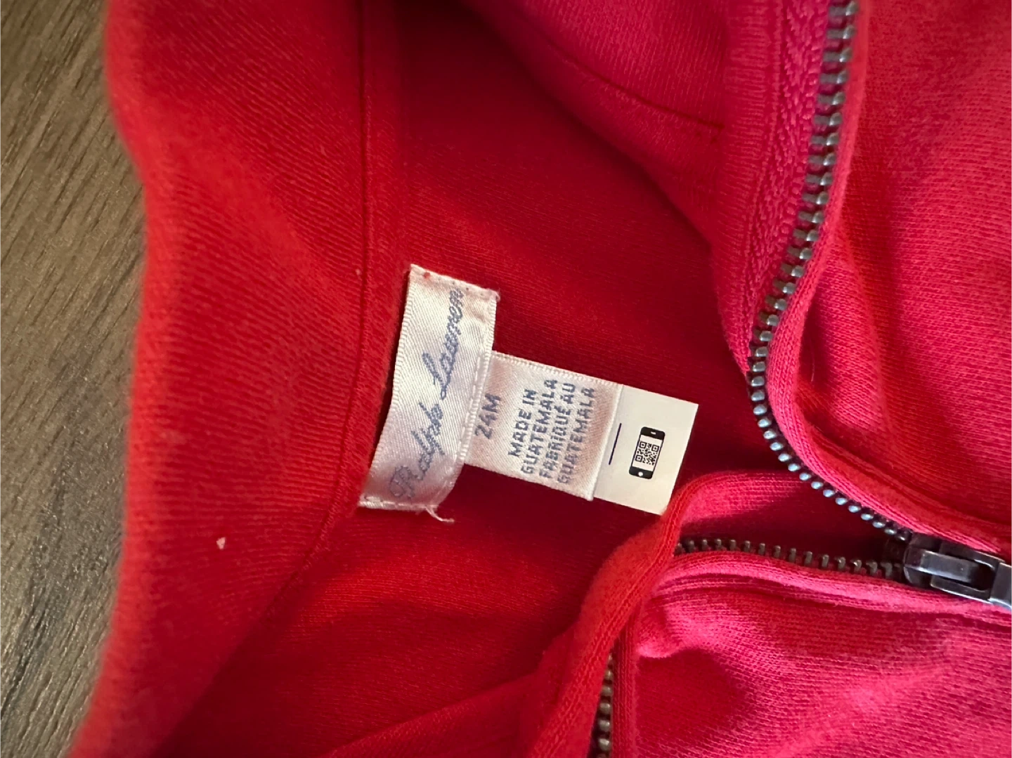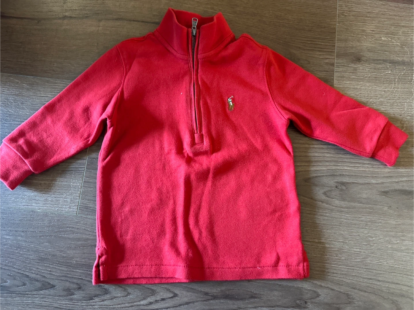 Here's a cute Ralph Lauren red pullover for your little one! It's in great condition and perfect for keeping them warm and stylish. The size is 24M.