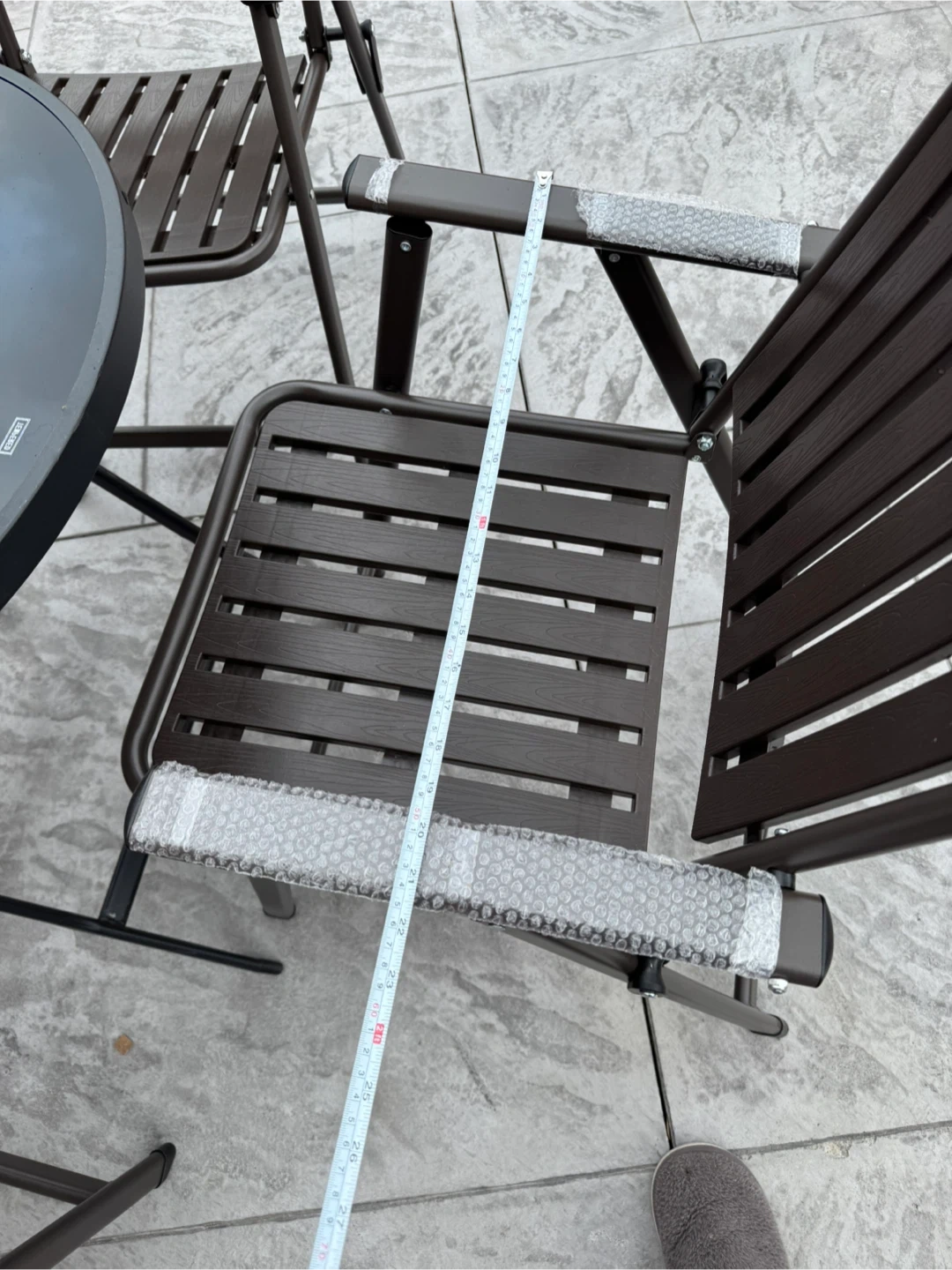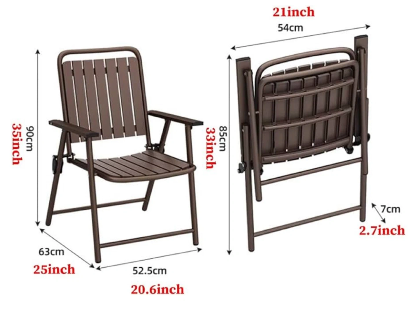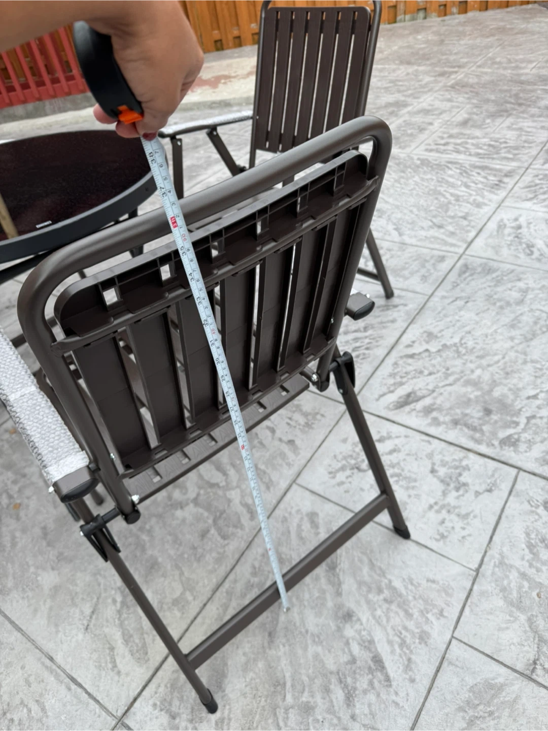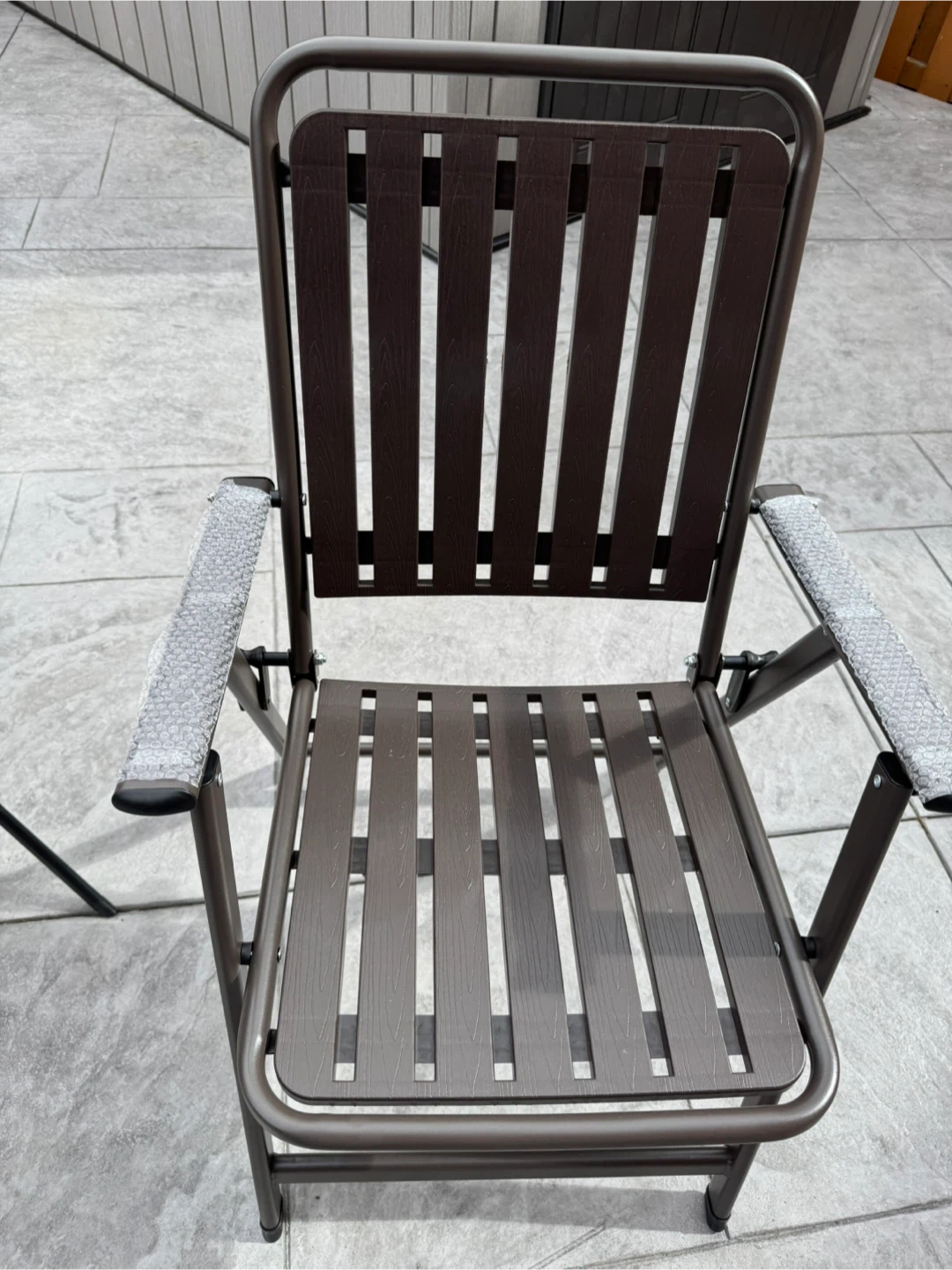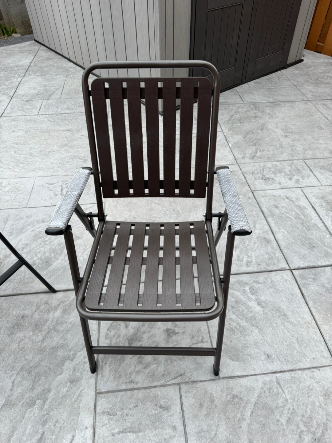 Selling brand new folding outdoor chair in brown. It's in great shape and perfect for your patio or backyard. The chair is easy to fold up for storage and transport. The dimensions are approximately 36 inches tall and 22 inches wide. It's made of a sturdy material that can withstand the elements