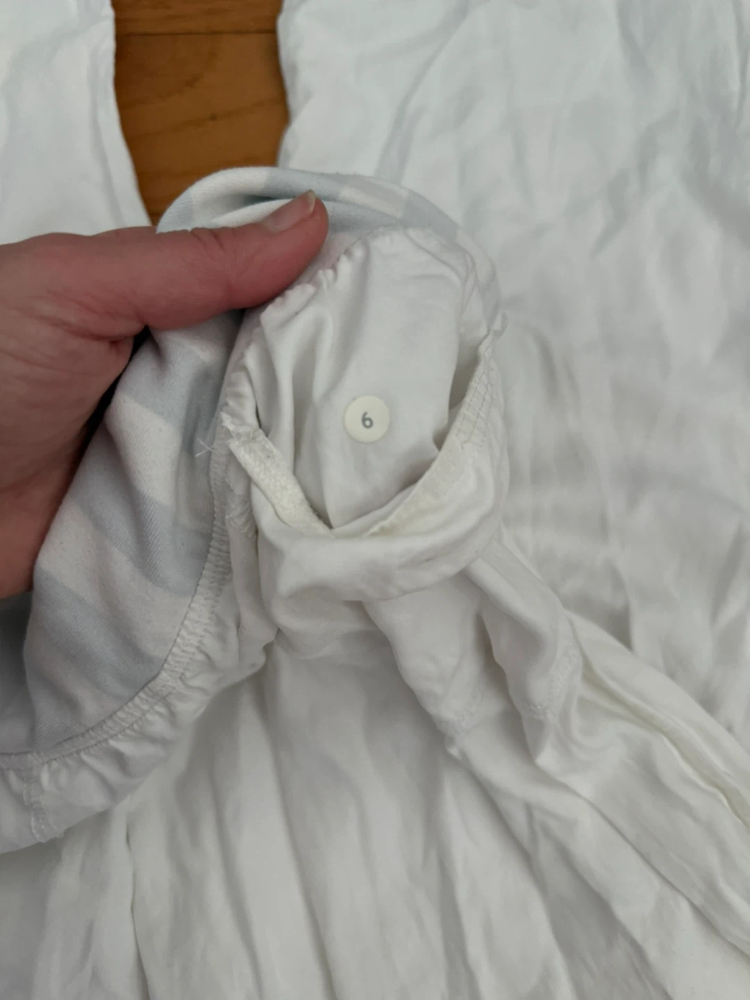 Soft white lounge pants with a striped waistband. These are the dance style Lulu pants