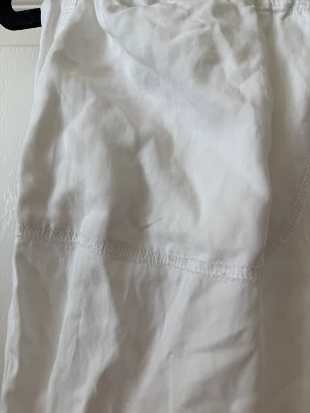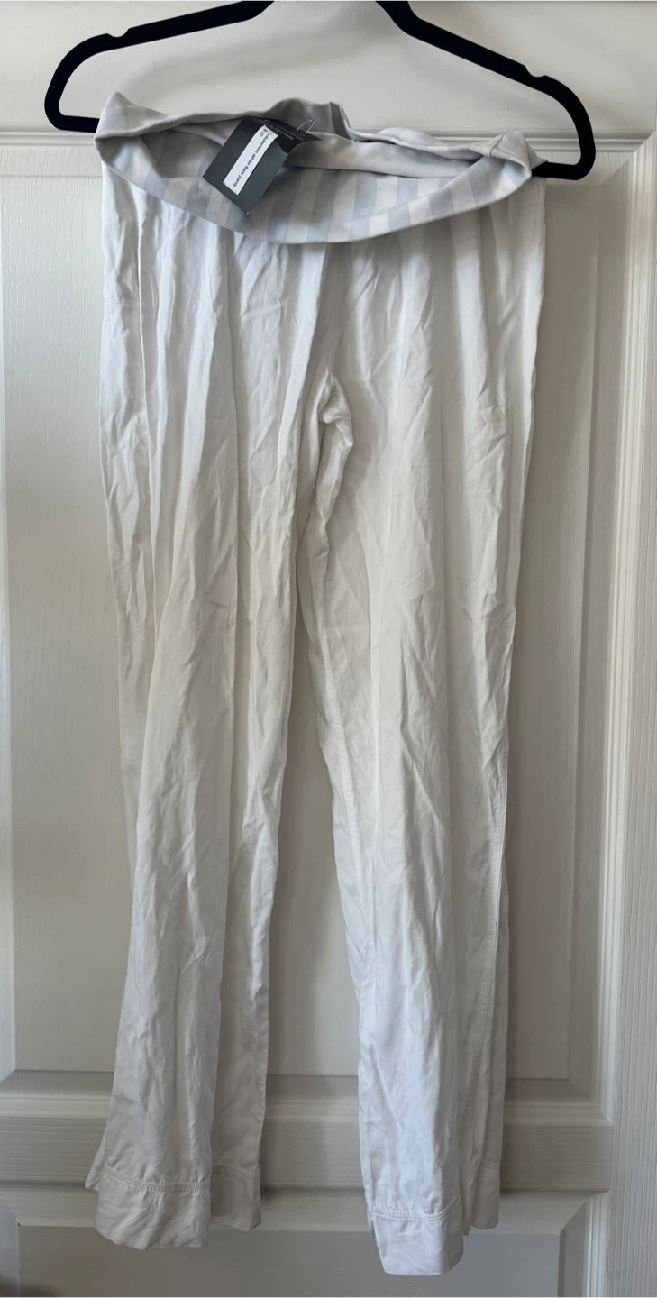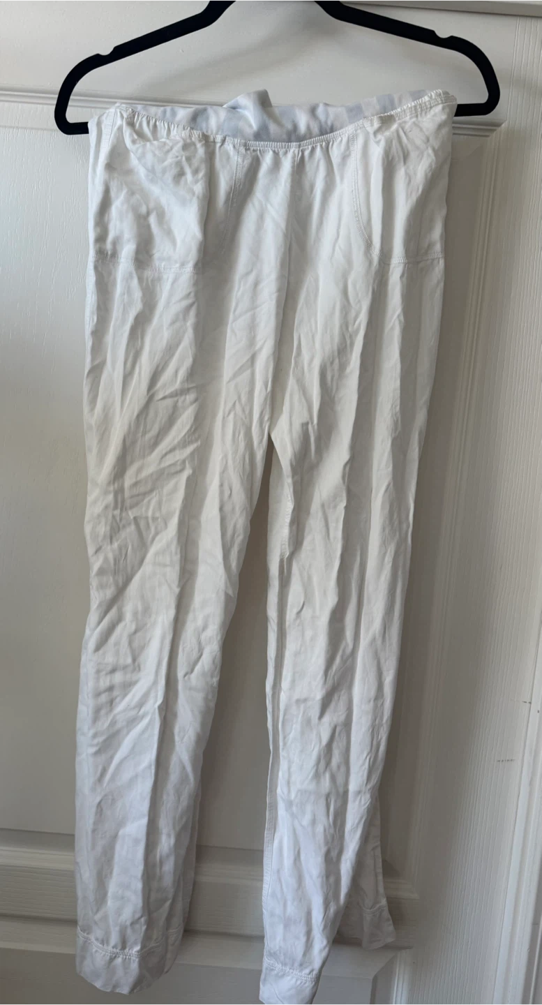Soft white lounge pants with a striped waistband. These are the dance style Lulu pants