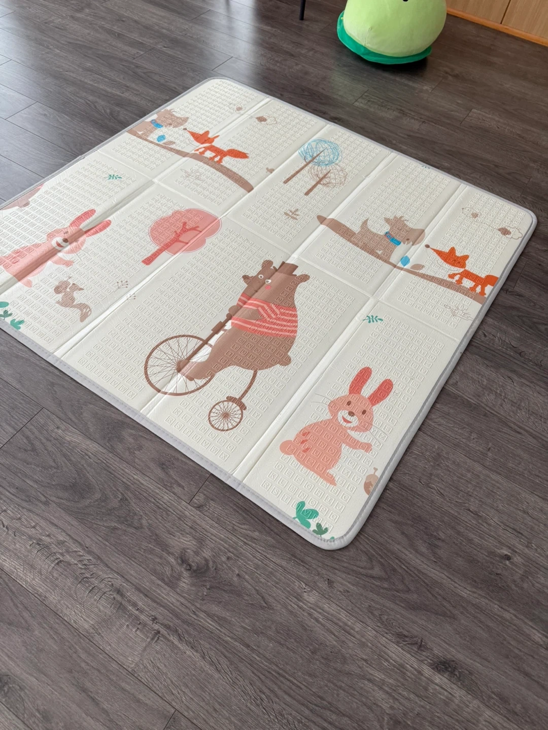 Selling a cute kids' play mat with a fun animal design! It features bunnies, foxes, and a bear on a bicycle. Perfect for creating a soft and safe play area for your little one