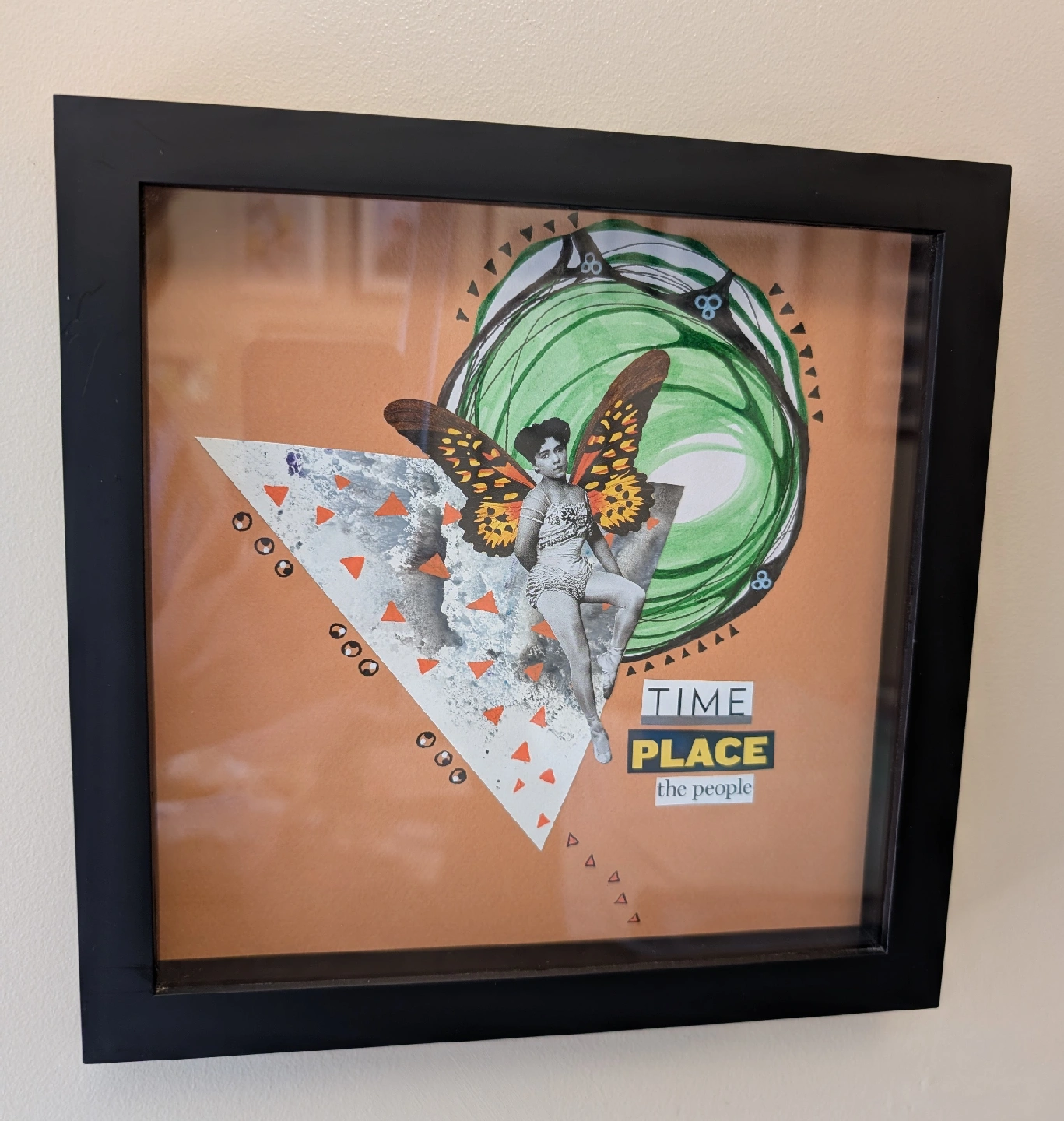 Affordable, original collage art piece, mixed media. Local artist. Framed. Approximately 9" x 9" including frame. Free delivery in Dundas or West Hamilton. Or pickup in Dundas.